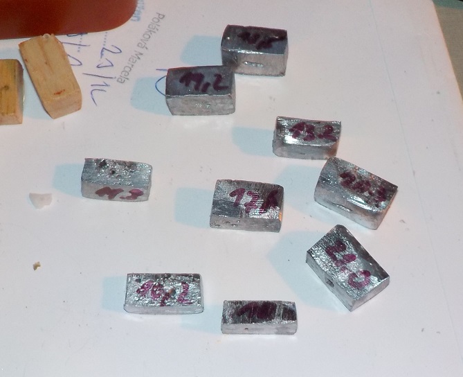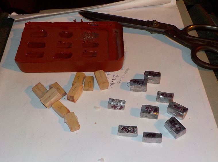 Tak tu mám první pokus o zátěže. Udělal jsem balzové mustry, koupil tepelně odolný lukoprén N5541, na druhý pokus zbastlil ne moc povedenou formu a spáchal prvních devět pokusných odlitků. Je to bída - co kus, to originál. Půdorysně jsem to dopasovával pilníkem na těch cca 9x17 mm, výška je různá (nahoru se to zužuje). Pro pokusné lití jsem nežhavil pícku, ale jen kalíšek s rukojetí na vařiči a naflákal to od oka - polovinu na druhý pokus a stejně to má bubliny. Olůvkům ještě chybí výkusy na šneky, ty do nich vyrazím dodatečně. Má to bubliny a váha je víceméně podle toho, jak se mi podařilo nalít "čepici" a pak to pilníkem dofackovat do požadovaného formátu.