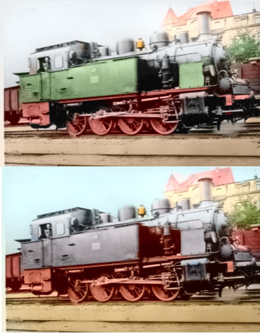 Zelená byla barva Länderbahnen (v Prusku, Sasku i Bavorsku norma), po jejich sjednocení do DRG/DR už jen černá s červenými koly. Dýmnice a komíny byly vždycky černé. Dýmnice je horká i zvenku, to pastelové barvy nemají rády. Černá barva (matná, dýmnice a komíny se ani nikdy neleštily, na rozdíl od ostatních částí kotle a dalších vnějších částí lokomotiv) se udržuje snáz. Ale u těch všelijakých Klein-, Kreis- a Bezirksbahnen to mohlo být s barvami různé, což by mohl být zrovna tento případ.