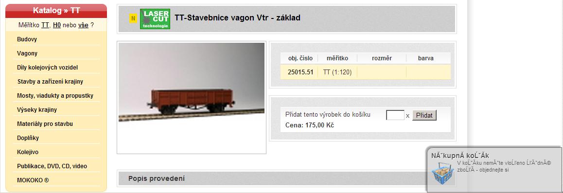 Taky to mám jako přílohu, schválně sem to zkoušel právě teď, jediné co nejde je nákup přes objednávky (bez obrázků ty se nezobrazily po klepnutí na ikonu , mě to vyplivlo a chtělo to přihlašovací údaje) ale z katalogu bez přihlášení v pohodě, v košíku se rovnou zobrazila cena. Postup katalog-vagony- myslím to byl Vtr v poli zadat jeden kus, sjet dolů na stránku úpně dole jsou obtisky, kliknul jsem na obrázek (obtisku Vase)- načtení další stránky obtisk Vtr-zadat jeden kus cena v košíku cca 220 -kliknutí na tlačítko v okně košíku se načetla stránka objednávky s podrobným výpisem a navigací dole na stránce vrátit se do objednávek- to mě hodilo na tu nekomunikující stránku (asi pro obchodníky) , nebo dokončení objednávky , tam sem to škrknul. Jediný rozdíl já měl nápisy v okně košíku normálně česky ale používám Mozilu od firefoxu.
