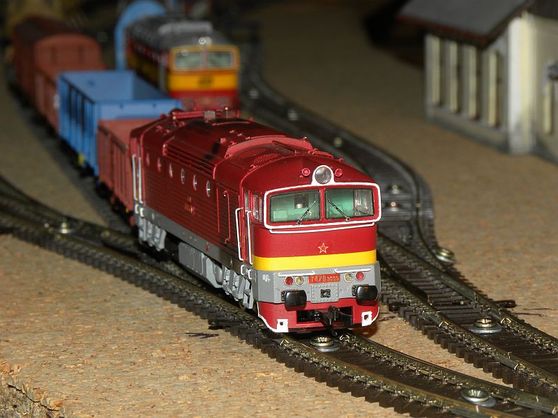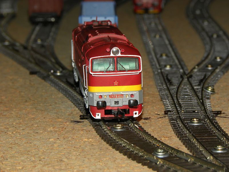 Někdejší českolipská T478.3009, postavená z modelu MTB. Na původní skříň MTB jsem dosadil střešní háčky z leptů HekTTor, síta ventilátorů v rovině střechy z leptů Detail, v obou bočnicích vybrousil větrací mřížku ve víku u kompresoru, naopak v pravé bočnici vedle tohoto víka zkrátil prolisy a dosadil malou větrací mřížku (velikostí zhruba odpovídající přebytek z leptu HekTTor pro úpravu rosničky T 334.0) a hlavně, na předním čele jsem zabrousil přípravu na montáž automatického spřáhla a zatmelil vnitřní dvojici světel. Leptané tabulky jsou z produkce pana Banka, znaky ČKD a výrobní štítky z leptů Detail. Je to můj první model MTB a s jeho jízdními vlastnostmi jsem naprosto spokojený (srovnávám s modely ROCO a Kuehn). Po dobrých zkušenostech se pouštím do úprav dalšího albínka, byť tentokráte to budou úpravy jen kosmetické (T 478.3065).