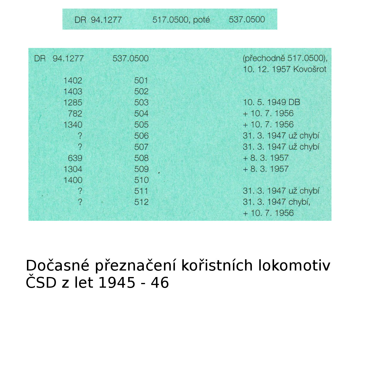 Tak, laskavostí Zdeňka Hrdiny (aka Zdepa) tady máme přehled dislokace lokomotiv 537.05 ex 94.5-17 DR v prosinci 1946: