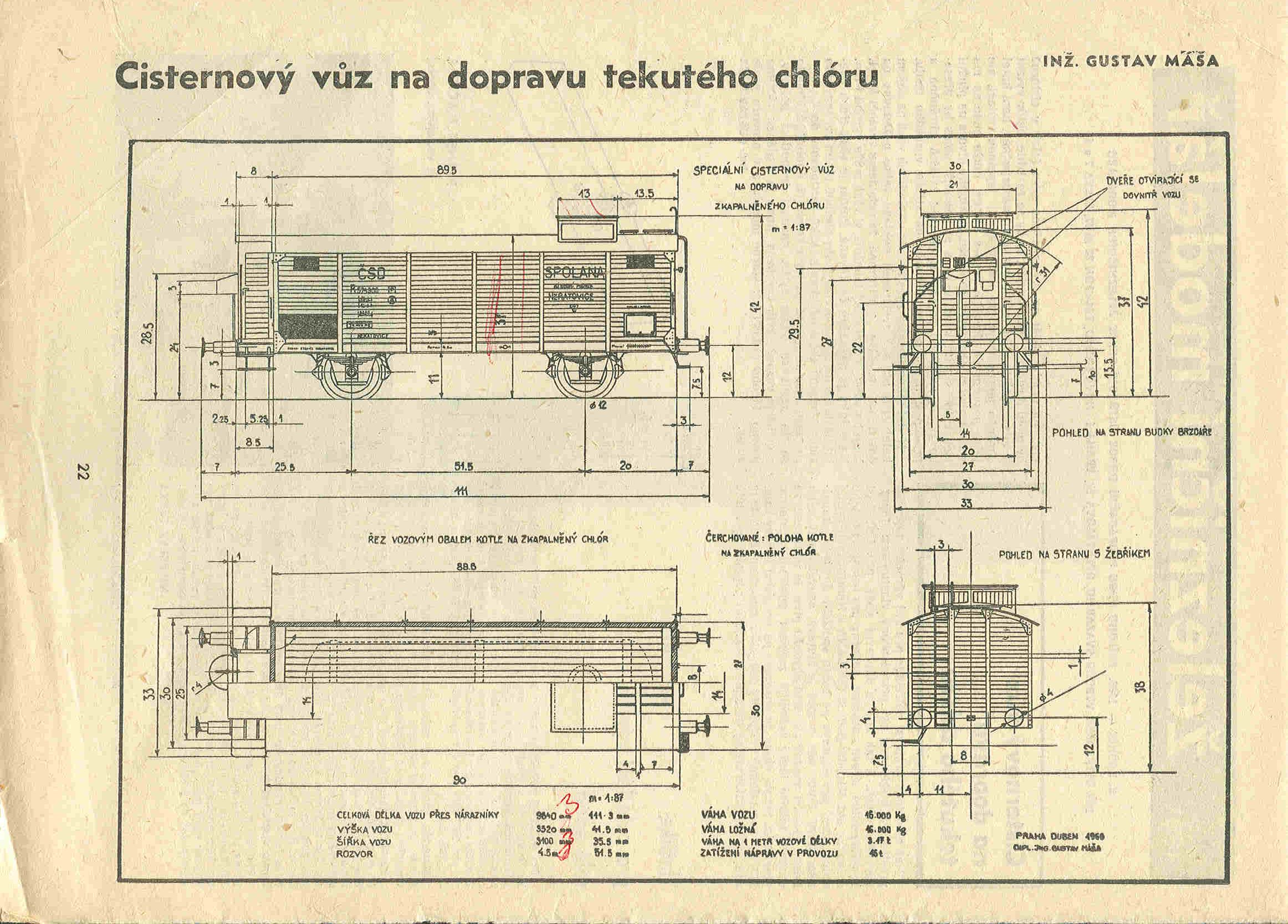 Z posledních novinek jsem si opatřil krásného žluťáska tj. vůz R ČSD, Spolku pro chem. a hutní výrobu Ústí n.L. Odhlédnu - li od hóóódně volného zpracování předlohy, zajímá mě ještě problematika označení takovýchto vozů. Vůz je primárně určen pro přepravu zkapalněného chlóru, takže by měl nejspíš podléhat nějakému zvláštnímu režimu přepravy....???? Chlór je dost jedovatý prvek, takže by vůz měl být nějak označen???? V brožuře z roku 1956 (Žel. návěsti a znamení) stojí, že vůz se zkapalněnými nebo stlačenými jedovatými plyny by měl být označen návěstí JED, tzn. černá lebka se zkříženými hnáty na bílém podkladu. Mohl být takový vůz zařazen kdekoliv ve vlaku nebo pouze na konci, jak to u některých nebezpečných přeprav bývalo???? Pokud na konci, tak předpokládám, že by měl mít, kromě návěsti JED, ještě denní/noční návěst označující konec vlaku, tj. červenobílý čtyř-trojúhelník nebo dvě červená světla.