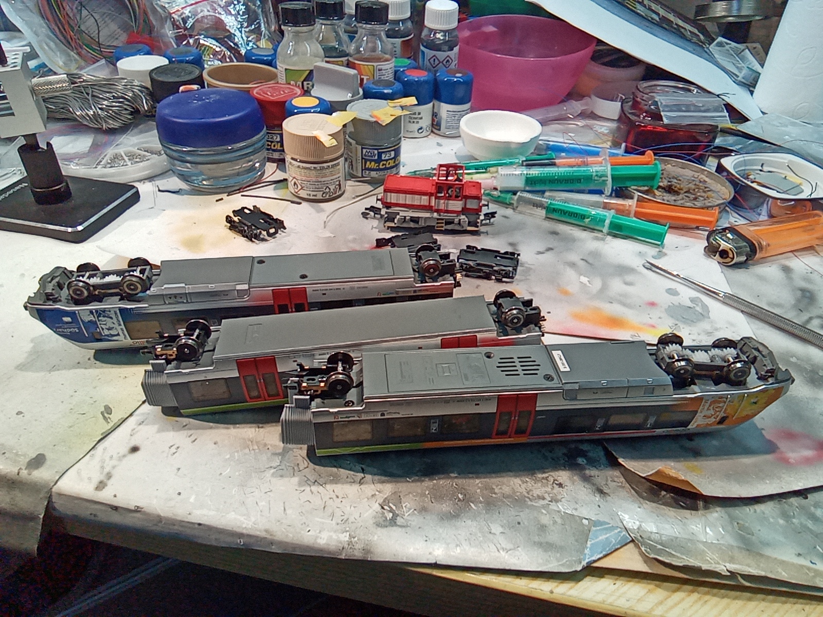 Tak jsem soupravu Abbelio trochu rozebral a zde je výsledek, na fotce odleva vůz se sběračem.