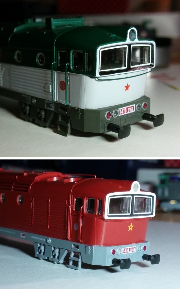 Ahojte.... je tu nejako mŕtvo, čo je škoda lebo sem chodím rád, keďže nemám veľa možností ako sa držať v nejakom kontakte s modelármi. Verím že niekomu padne vhod môj príspevok ako rada, názor, či inšpirácia. Svoj začínajúci vozový park som totiž rozšíril na celkom tri okuliarniky (2x zeleno biely, jeden červený) a jednu barču (červeno biela. Všetko ČSD. Pre MTB som sa rozhodol z viac dôvodov, medzi nimi to že je vyberať až tak nieje z čoho a zo všetkých mi MTB asi vyhovuje najviac. Všetko má ale nejaký háčik a MTB má nižšiu továrenskú kvalitu. Niekomu stačí, niekomu nie, niekto nekúpi, a potom som tu ja, ktorý si kúpi MTB a upraví si. A tu to začína. Ako absolútne prvé mi udreli pri bližšom skúmaní dve veci - veľmi krivé a zle tvarované madlá a nepresne namalované strieborné obruče svetiel. Na fotke je to dosť vidieť. Okrem toho sú svetlovody akási krivoľaká guľatina ktorá odleskom ukazuje aká je z predu hrbolatá. Nič čo by sa nedalo napraviť, len je to prplačka. Vnútro je ok, až na to že neviem ktorý inteligent v MTB (fakt pardon ale nápad to je naozaj bezmyšlienkový) vymysel aby sa tam dal miesto vazelíny tekutý olej. On je ako mazivo skvelý, veľmi dobre maže a dobre zateká... a zateká aj tam kde nemá. Potom sa vám ľahko stane že pri vybalení novej lokomotívy sa čudujete prečo je celá aj s krabičkou zamastená. A zistíte že to prevodový olej bez zábrany uteká kam sa mu chce. Takže zase robota navyše. Chýba mi nárazník bez diery na spriahlo ktorý teda mohli dodať, ale vyrobené prototypy už mám, tak ak niekto chce, za symbolický peniaz poskytnem.