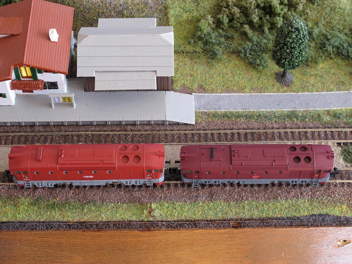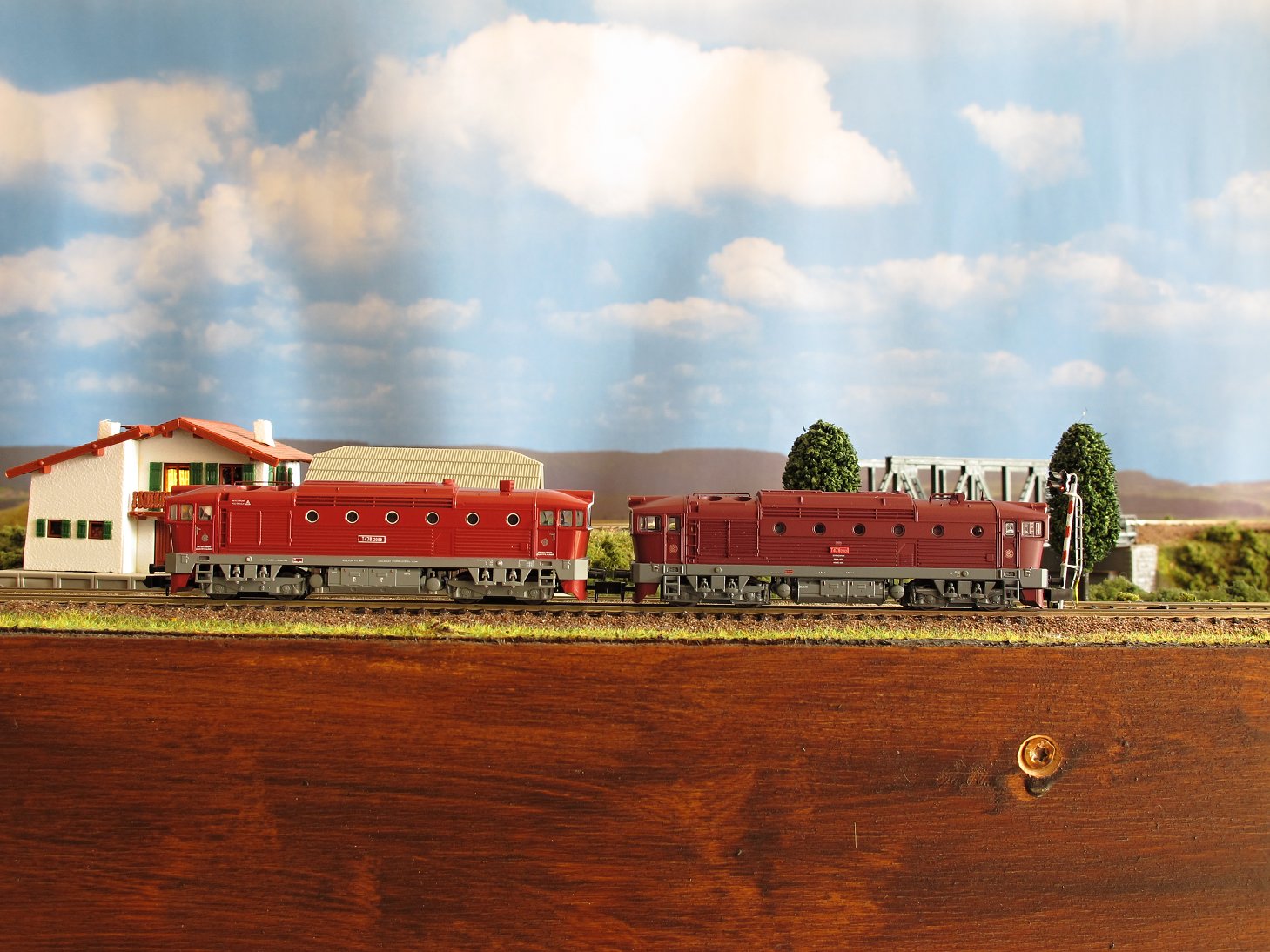 Po vybalení z krabičky mne mašina příjemně překvapila, model má velmi precizně provedené detaily. Jediným rušivým prvkem jsou poměrně mohutné a mírně vykloněné schůdky, zjevně pro získání dostatku místa pro podvozky při průjezdu v obloucích. Těmi mašina projede bez problému včetně R1. Ze stejných důvodů jsou pružně uchycené (vyklánitelné) závěsky. Příjemným překvapením byl velmi tichý a naprosto pravidelný jízdní projev. Zklamání přišlo, když jsem zapnul zvuk. Zcela totiž postrádá nízké kmitočty a má poměrně malou hlasitost. Mám několik ozvučených lokomotiv, ale tak špatný zvuk nemá ani jedna z nich. Další problém se projevil při jízdě po mém domácím kolejišti – na řadě výhybek mašina ztrácela kontakt a buď přibrzdila, nebo se při pomalé jízdě zastavila. Nepříjemné je, že přitom v důsledku ztráty napájení vypadl zvuk a postupně znovu naběhl. Na vině je zřejmě způsob snímání proudu, údajně převzatý od firmy Kato. Na osy přečnívající přes kolečka je nasazen plíšek s otvory. Ten je s plošným s elektronikou spojen kablíkem. Na vnitřních dvou nápravách jsou vždy na jedné straně bandáže, ty jsou tedy umístěny do kříže. Podotýkám, že mám koleje pečlivě vyčištěné a mám napájené srdcovky, kolečka mašin také čistím, takže to nemůže být důvodem ztráty kontaktu. Všechny ostatní lokomotivy různých výrobců které mám zde projíždějí bez problémů, s výjimkou jedné lokomotivy od firmy Kato, mající stejný způsob snímání a rovněž bandáže do kříže. Ta se sice při pomalé jízdě zastavuje na méně místech, nicméně je i to nepříjemné. Kruhový reproduktor je umístěn na spodku lokomotivy v nádrži, která je opatřena mřížkou. Reproduktor nemá obvyklou ozvučnici. Tohle řešení není šťastné, určitě by bylo vhodnější použít běžně používaný obdélníkový reproduktor s ozvučnicí, nádrž by zde mohla sloužit jako ozvučnice (samozřejmě bez toho otvoru s mřížkou). Místa je zde ovšem na výšku velmi málo, pouze 4,64 mm plus případně ještě 0,4 mm při zeslabení spodku nádrže, jinde v lokomotivě místo na reproduktor není. Připojuji pár obrázků modelu ve srovnání s modelem MTB. Rozměry u Minitrixu lépe odpovídají reálu, model MTB je širší a delší, naopak schůdky u Minitrixu jsou příliš mohutné a zasahují do strany. Je sice dodržen normovaný průjezdný profil podle NEM, u nástupiště mi ale narážejí na nástupiště (tam ale já nemám dodrženu normu). Nešťastné je u Minitrixu řešení dekodéru. Jak je bohužel u Trixu běžné, nepoužívají se obvyklé patice dekodérů, takže záměna za jiný je prakticky nemožná, navíc u tohoto modelu jsou pokud mohu soudit některé funkce zajištěny elektronickými prvky na základní desce a nejsou tedy součástí samotného dekodéru. Funkcí je řada a k jejich volbě jsou použity funkce F0 až F14, jenže se mi zatím nepodařilo sehnat podklady pro nastavení dekodéru. Je škoda (a netýká se to jen tohoto modelu), že neexistuje norma pro používání obsazení funkcí, u tohoto modelu je například zvuk motoru na F2 a na F1 je houkačka, zatímco u ostatních je většinou motor na F1 (ale také mám model kde je na F4). Přiřazení funkcí je sice i dekodérů možné změnit, ovšem k tomu je potřeba mít manuál k dekodéru a ten bohužel k tomuto modelu není běžně dostupný). Je třeba hezké, že je možné samostatně vypnout zadní světla, jenže v jednom směru je k tomu potřeba použít F6 a v opačném F8. Úplnou nehorázností je zvuk staničního hlášení – je zde totiž hlášení odjezdu autobusu na letiště z pražského hlavního nádraží. To je zvlášť pikantní u modelu ČSD ze sedmdesátých let, ale také třeba u ČD Cargo.
