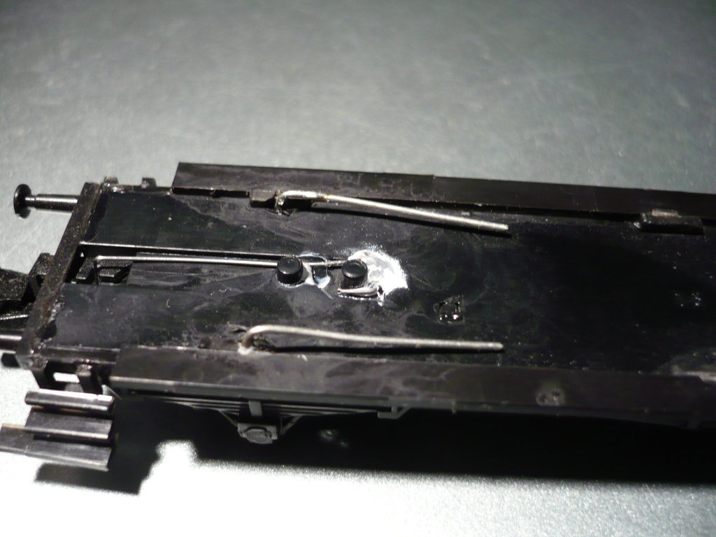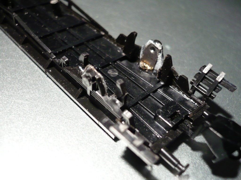 Tato plechová obložení jsou použil při stavbě vozů Be, Bi, Ds ze stavebnic od bývalých LPH Jičín. Vybrousil jsem v rozsochách drážky na šířku pásku s jamkou ložiska. Z celého obložení jsem použil boky, které jsem vlepil gelovým vteřiňákem do vybroušené drážky. Jelikož hodlám vozy osvětlit, využil jsem plechových ložisek k vyvedení proudu z náprav. Na ložiska jsem přiletoval odštípnuté vývody z radiosoučástek, podlahu vozu provrtal milimetrovým vrtákem a vývody protáhl podlahou. Obdobně jako to má ve svých vozech vyřešené Schirmer. Doporučuji použít oboustranně izolované nápravy. Řešení je vidět na fotkách. K osvětlení použiji teple bílých SMD LEDek, u žlutých mi připadalo jako by byl salon osvětlen sodíkovými uličními výbojkami.