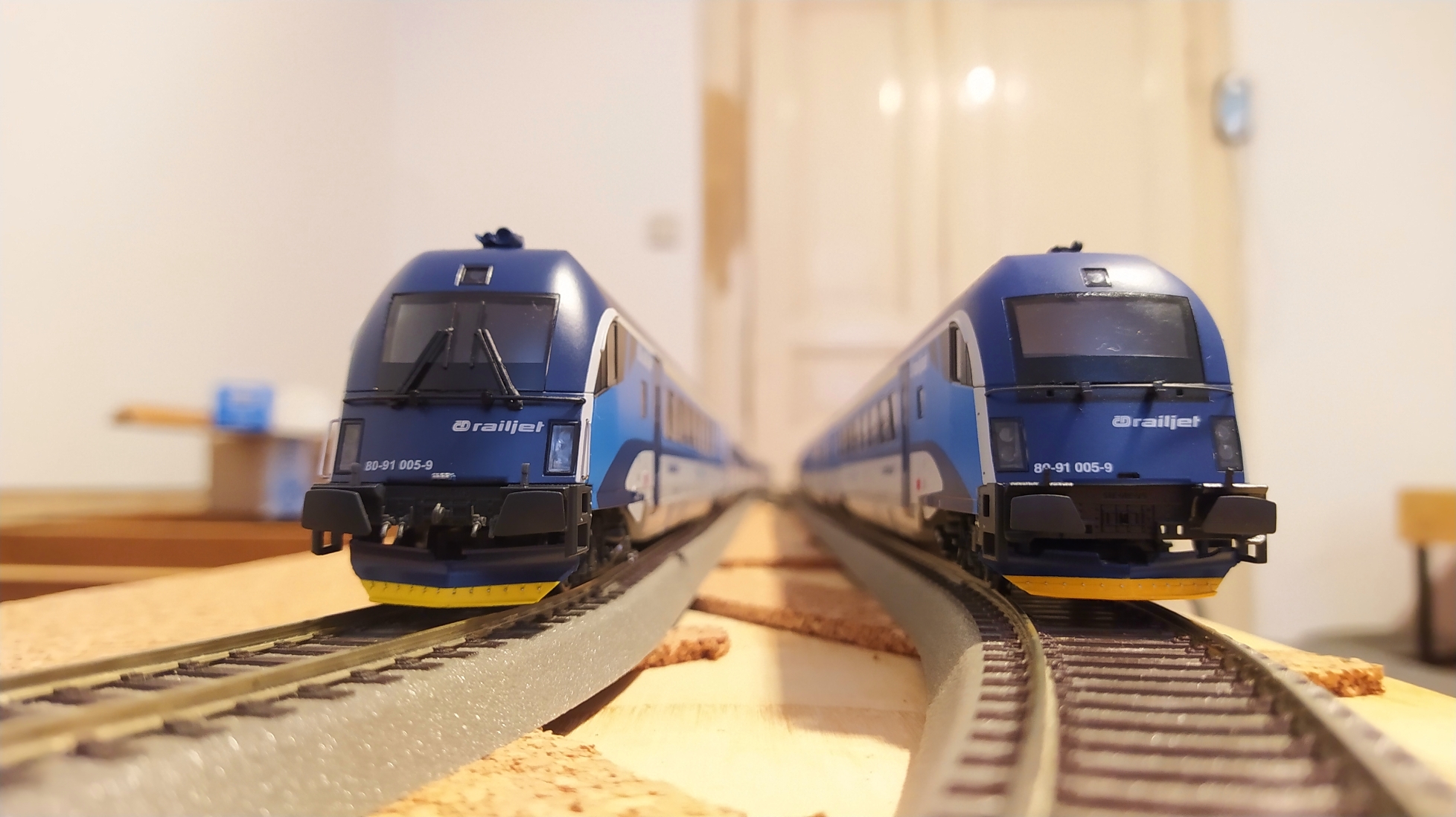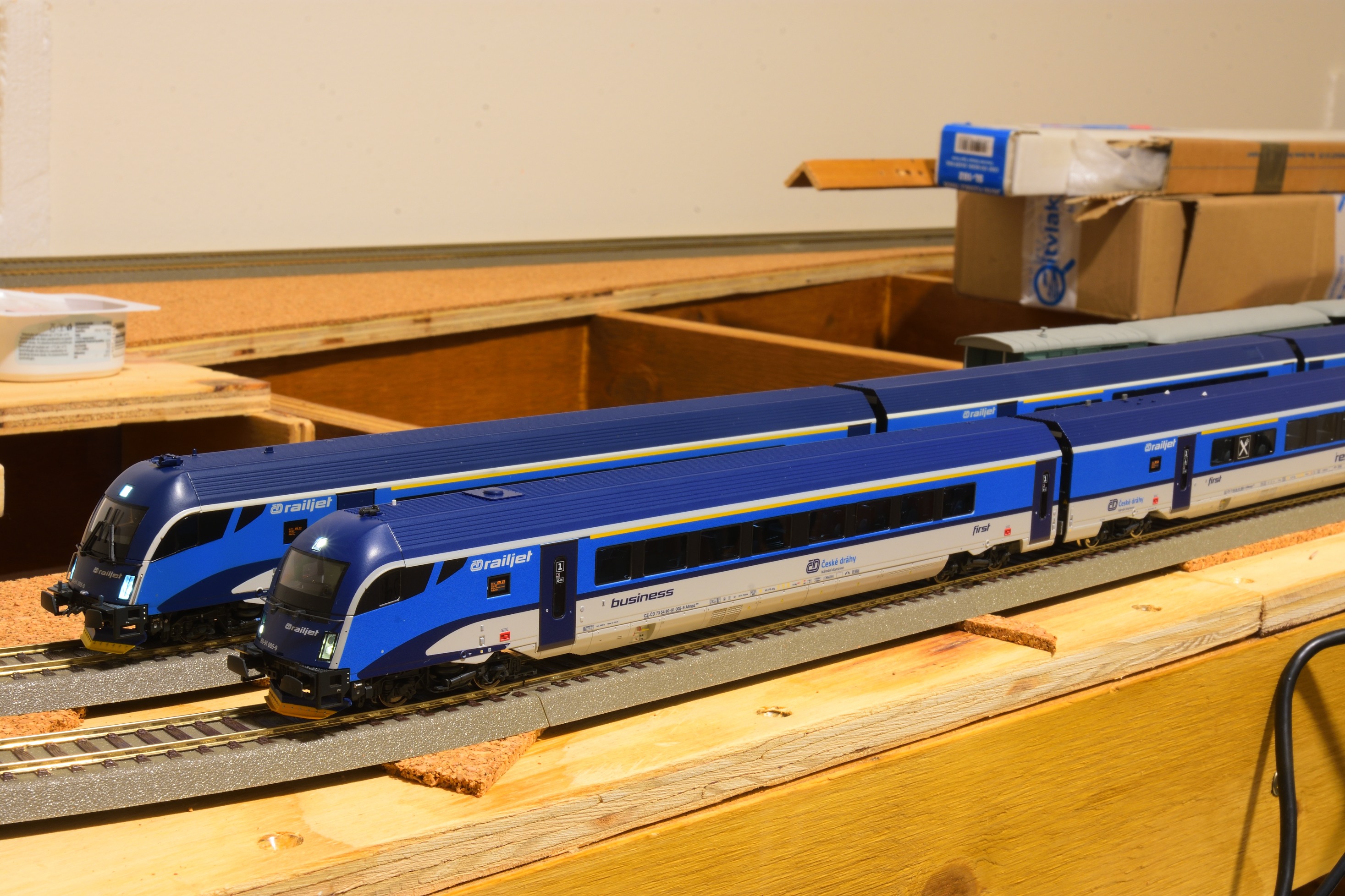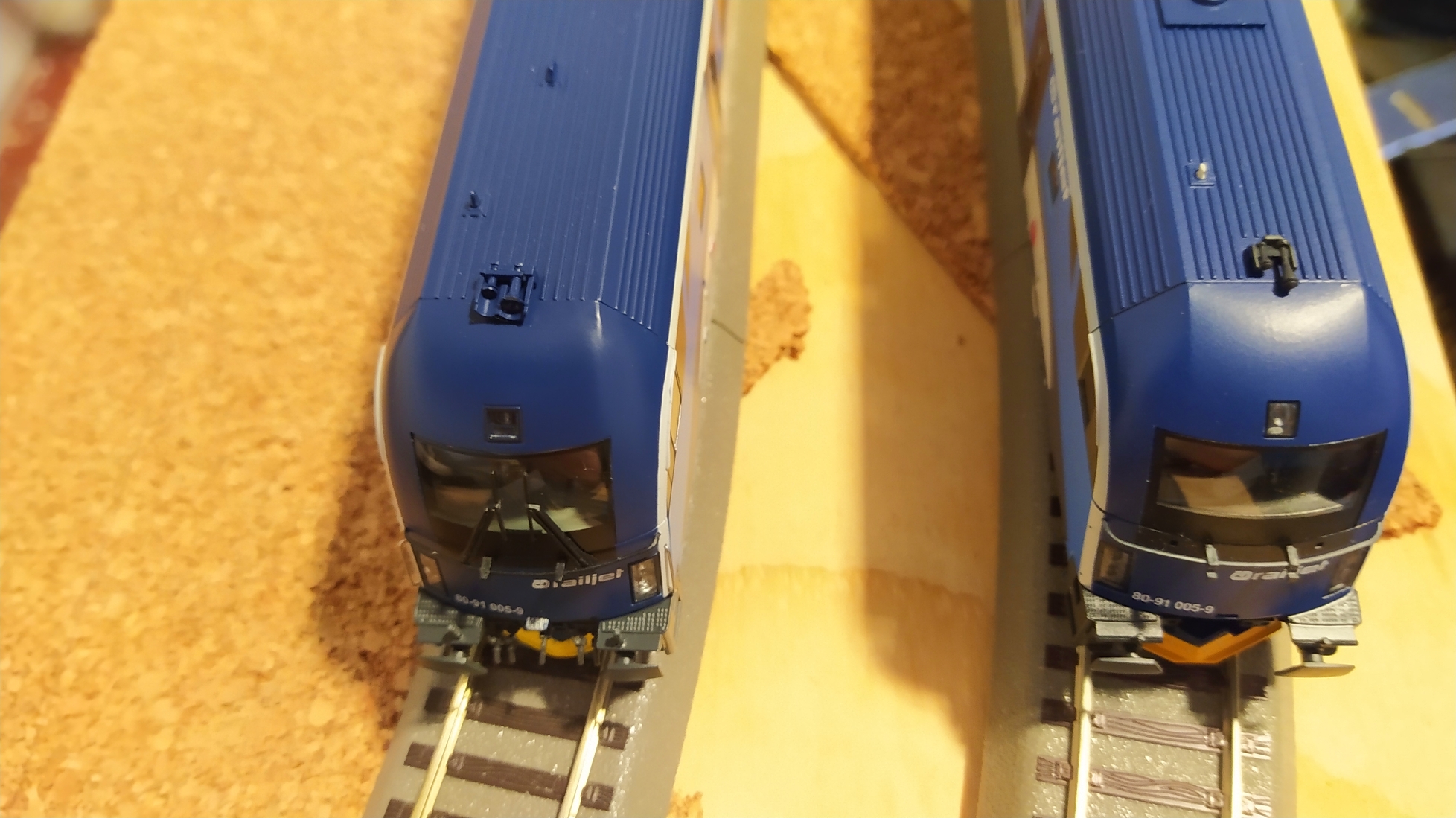 rozdíl v odstínu OBB roco a JG je nepatrný. Co se týče spřáhel, Jagerndorfer má přibalený jen očkový spřáhla a má klasický kinematiky se stadnartním umístěním, kdežto ROCO má kinematiku vystrčenější a když tam dám spřáhla, tak vznikne mezera mezi vozy víc jak půl centimetru. Roco musí mít nějaký svoje propojky, jsou i výškově jinde.Ty rokácký