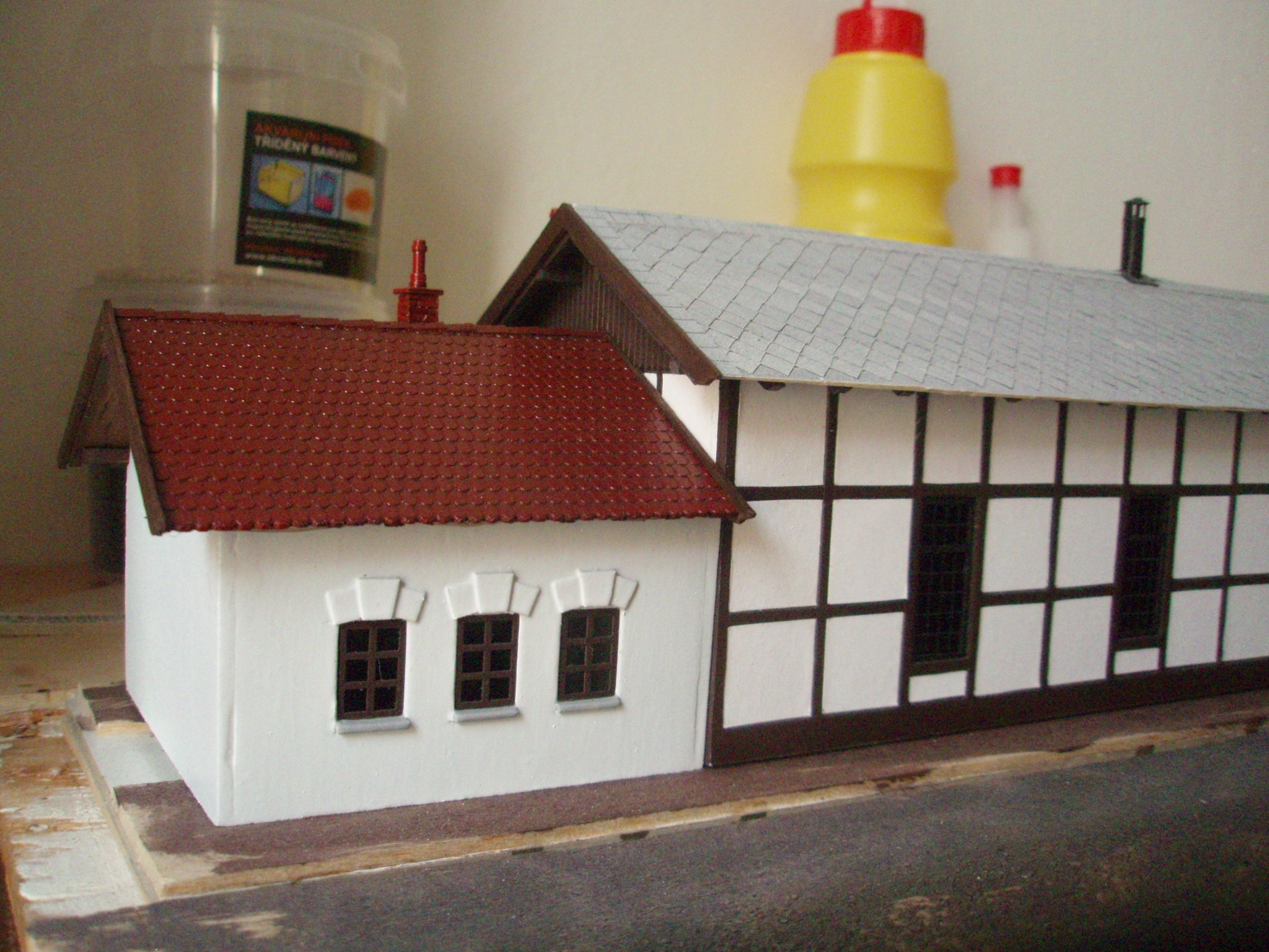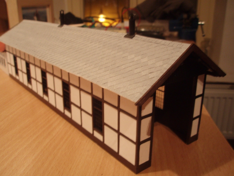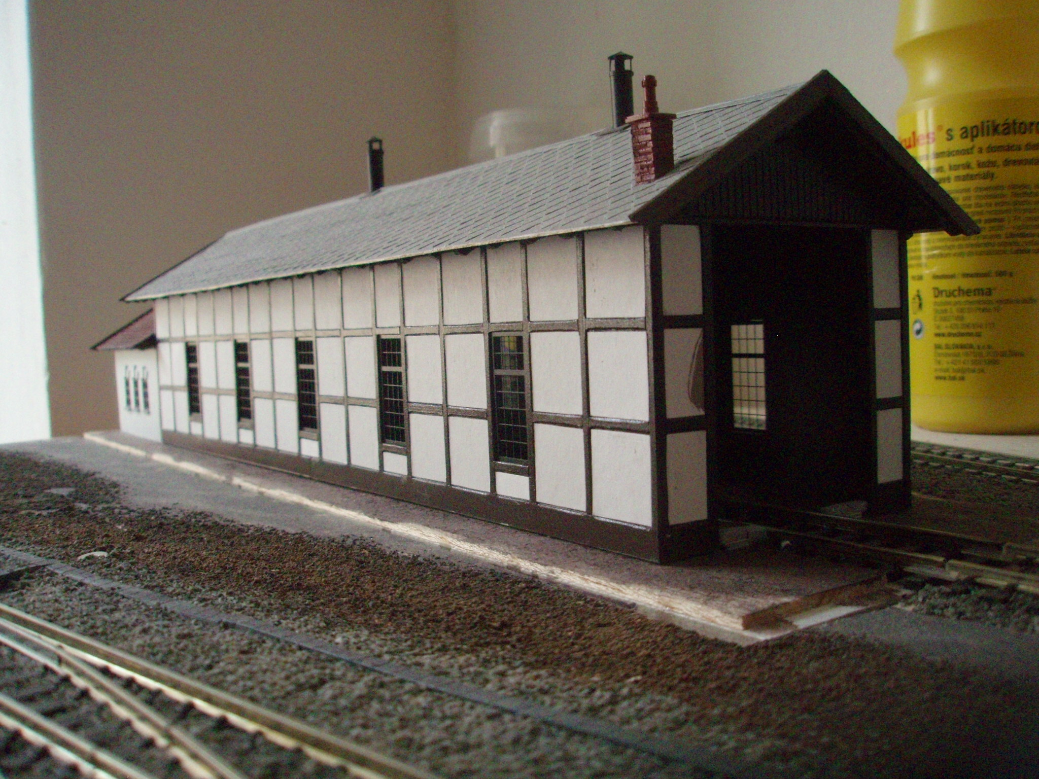 ke stavbě této výtopny mě inspiroval článek na http://vytopna.hekttor.biz/. Podobná výtopna z hrázděného zdiva stojí například v Blatně nebo v Mladoticích. Model je z polystyrenových desek tl. 2 mm, na které je nalepena struktura dřevěné konstrukce. Výplň (zdivo) je z papíru natřeného akrylovou barvou. Střecha z barvené čtvrtky a krov z balsy. Okna, vrata a další doplňky jsou z leptu. Teď pracuji na dokončení přístavku za výtopnou, pak přijde vnitřek polepit tapetou znázorňující vnitřní zdivo výtopny, zasklít okna, osadit na sokl, doplnit dorbotinu a mašiny už nebudou klepat kosu na kusé koleji