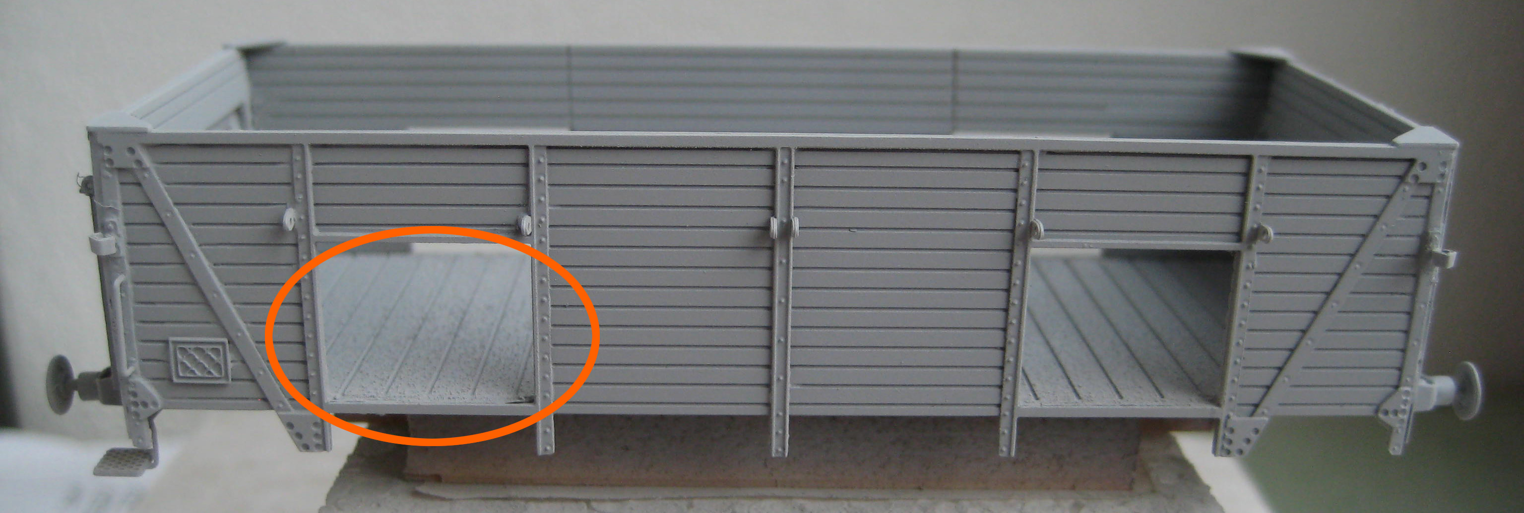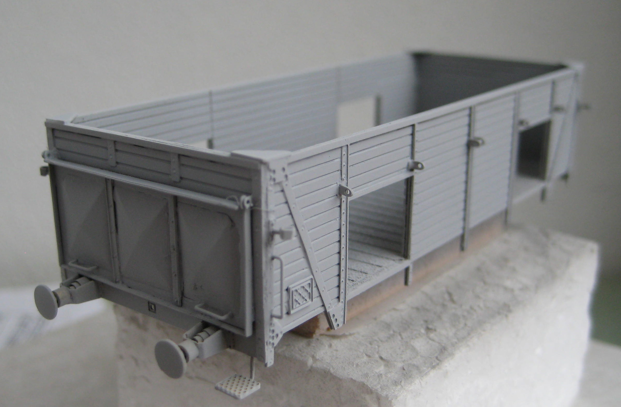 není z krabičky. Přidané jsou rohové trojúhelníkové výztuhy nahoře na rozích korby. Potom 4 svislé výztuhy pevné čelnice (při které má vagon s brzdou budku).
