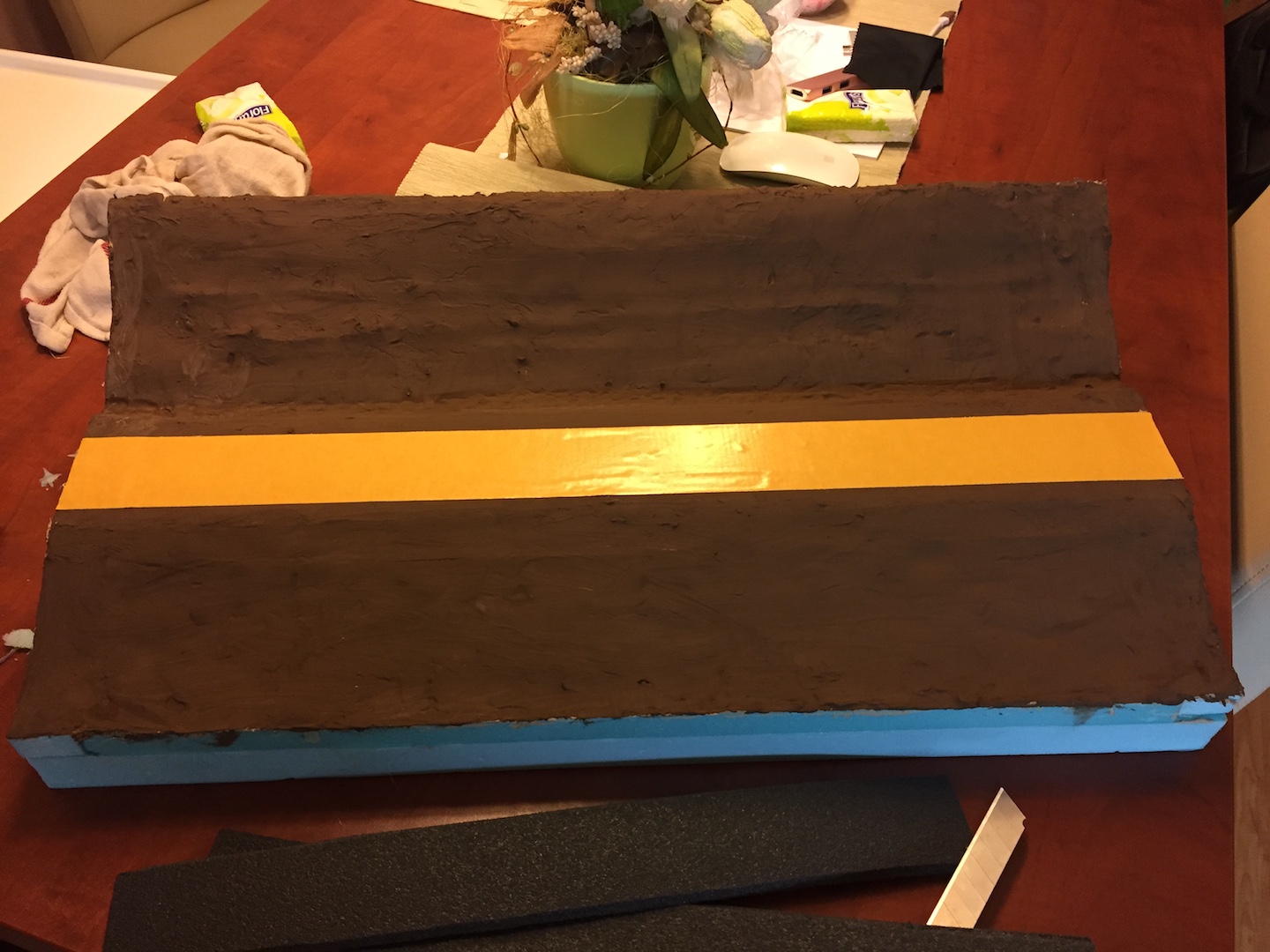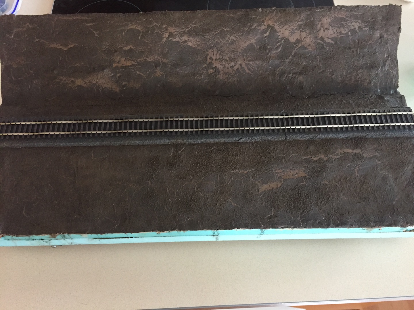 Polystyren/styrodur natrit disperznim lepidlem cca 1:1 redenym vodou. Do lepidla stetcem s redenym lepidlem zahladit papirove ubrousky. Klidne dat i druhou vrstrvu do krize je pak povrch jak beton. Po zaschnuti natrit hnedou vodoureditelnou barvou. Opet po zaschnuti jsem povrch natrel modrym neredenym duvilaxem a primo do nej sypal ve velke vrstve presatou hlinu. Klidne rukama a klidne i 1cm na vysku. Co se ma chytit do lepidla to se chytne, zbytek po otoceni modulu spadne. Pak statika. S nejakym praskanim hliny nemam problem.