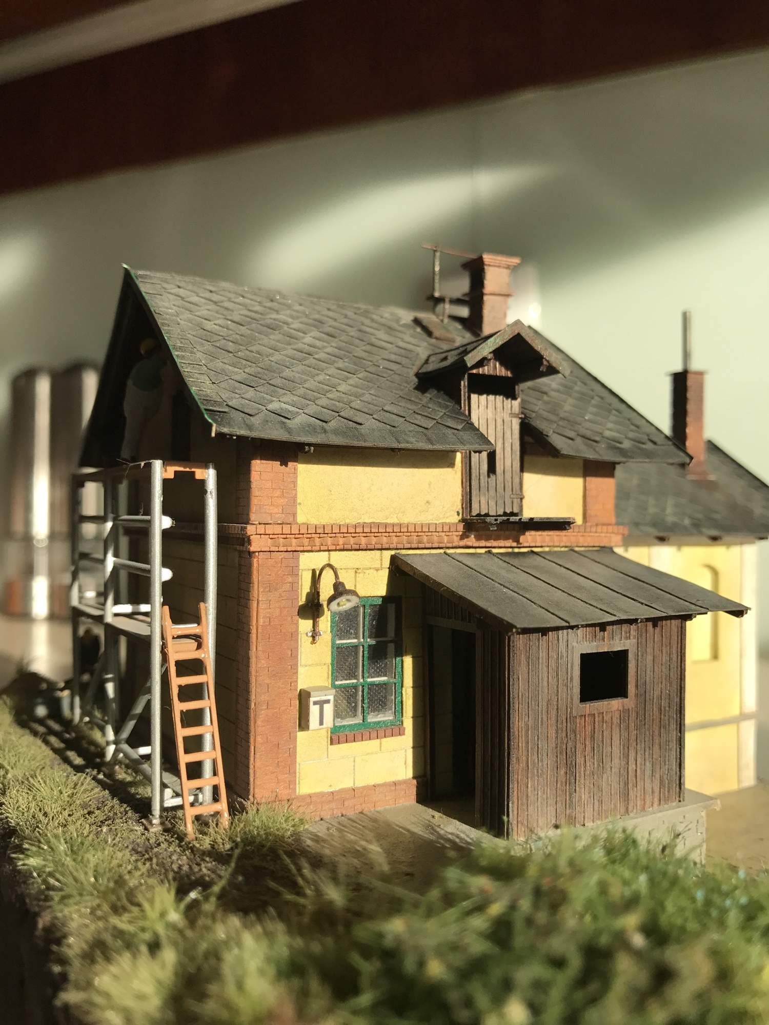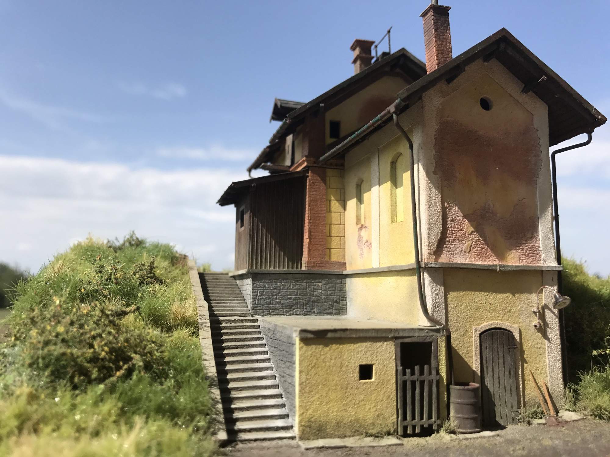 Tak jsem po dlouhé době skoro u konce se stavbou. Stavebnice od Igry je velmi pěkně provedená. Udělal jsem však pár drobných úprava a doplnění, které by mohly být klidně součástí stavebnice. Původní schodiště nevedlo na podestu (bylo příliš příkré) a tak jsem ho upravil, aby bylo možné ze schodiště na podestu vstoupit. Zatím ale nevím co na ni umístit. Pokud máte nějaké nápady, sem s nimi. Dále jsem doplnit dlaždice kolem domu. Na ty jsem použil zbytky ze stavebnice a nařezal z nich malé čtverce, které následně nabarvil a patinoval. Ještě chybí okapy a svody. U vstupu do chlívku nebo dřevní (co to vlastně je) plánuji dát sud, do kterého bude okap sveden.