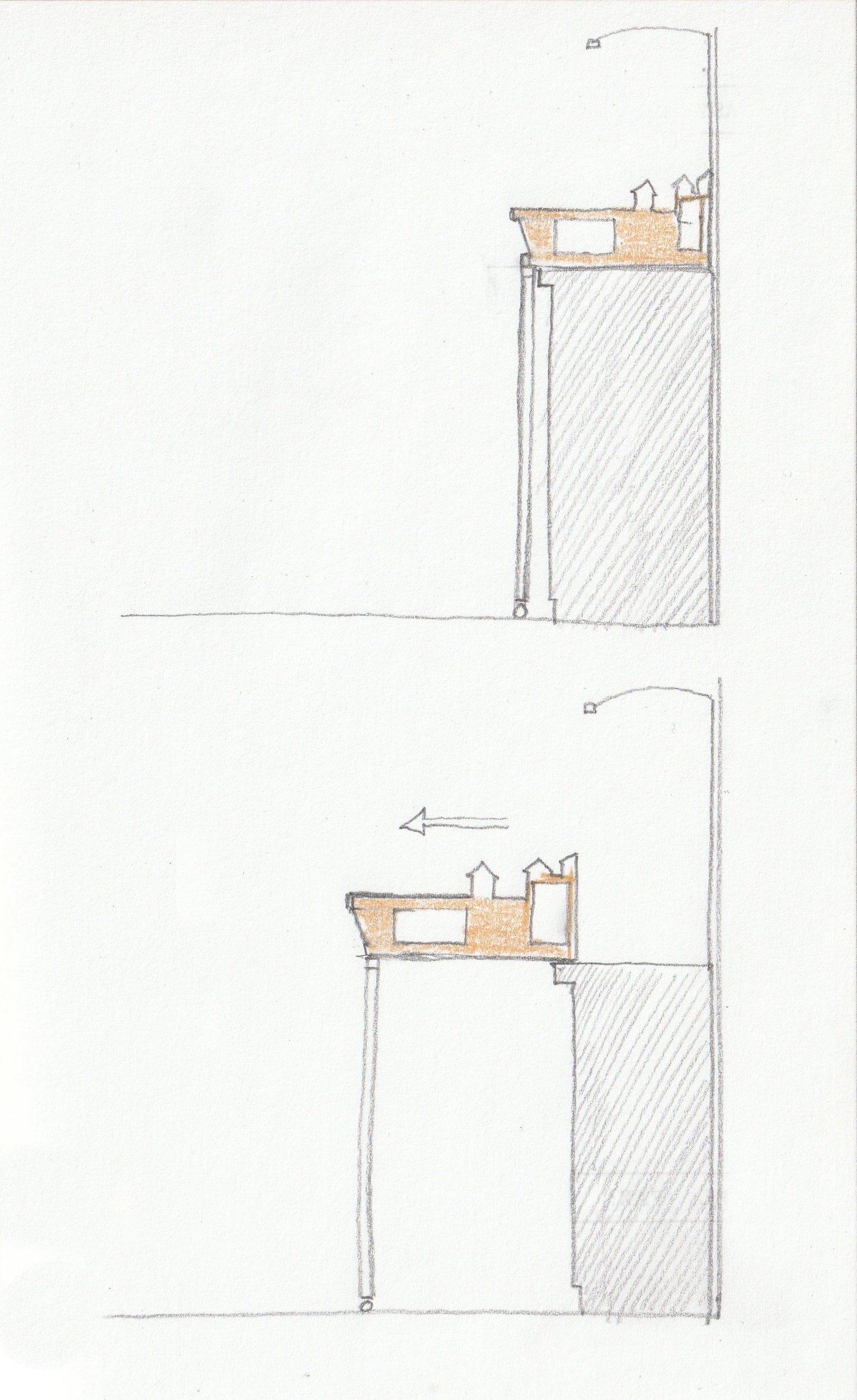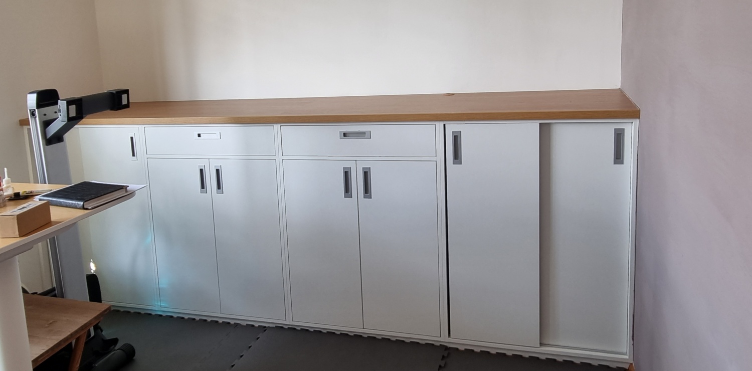 Bude to většinu času položeno na stabilních skříňkách, které jsou zády u stěny.