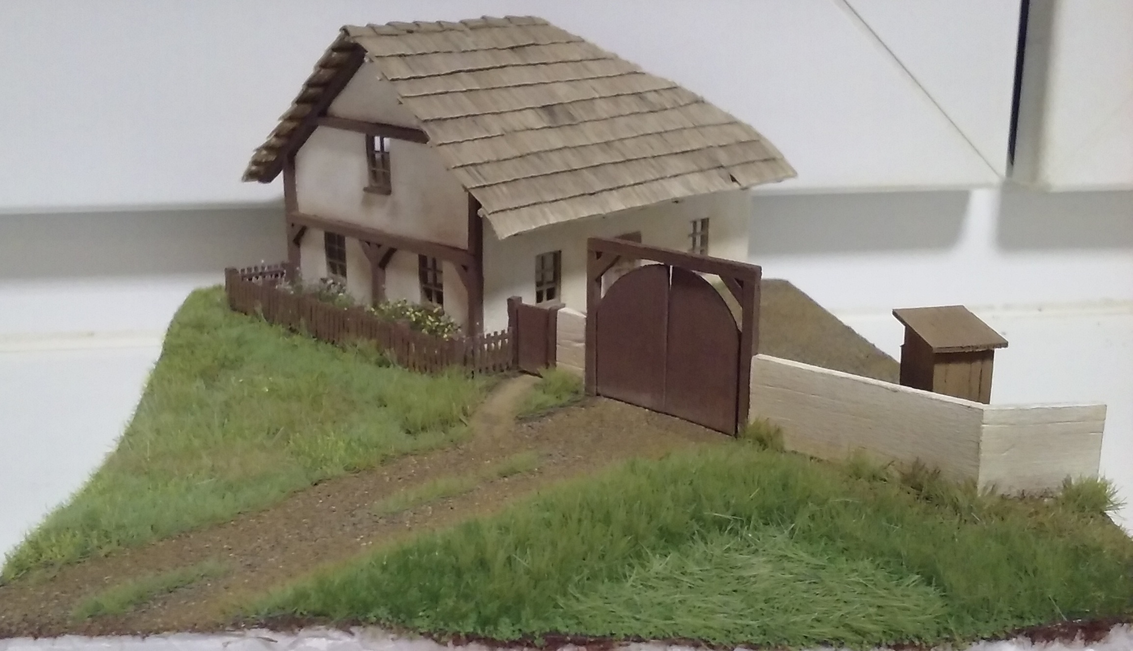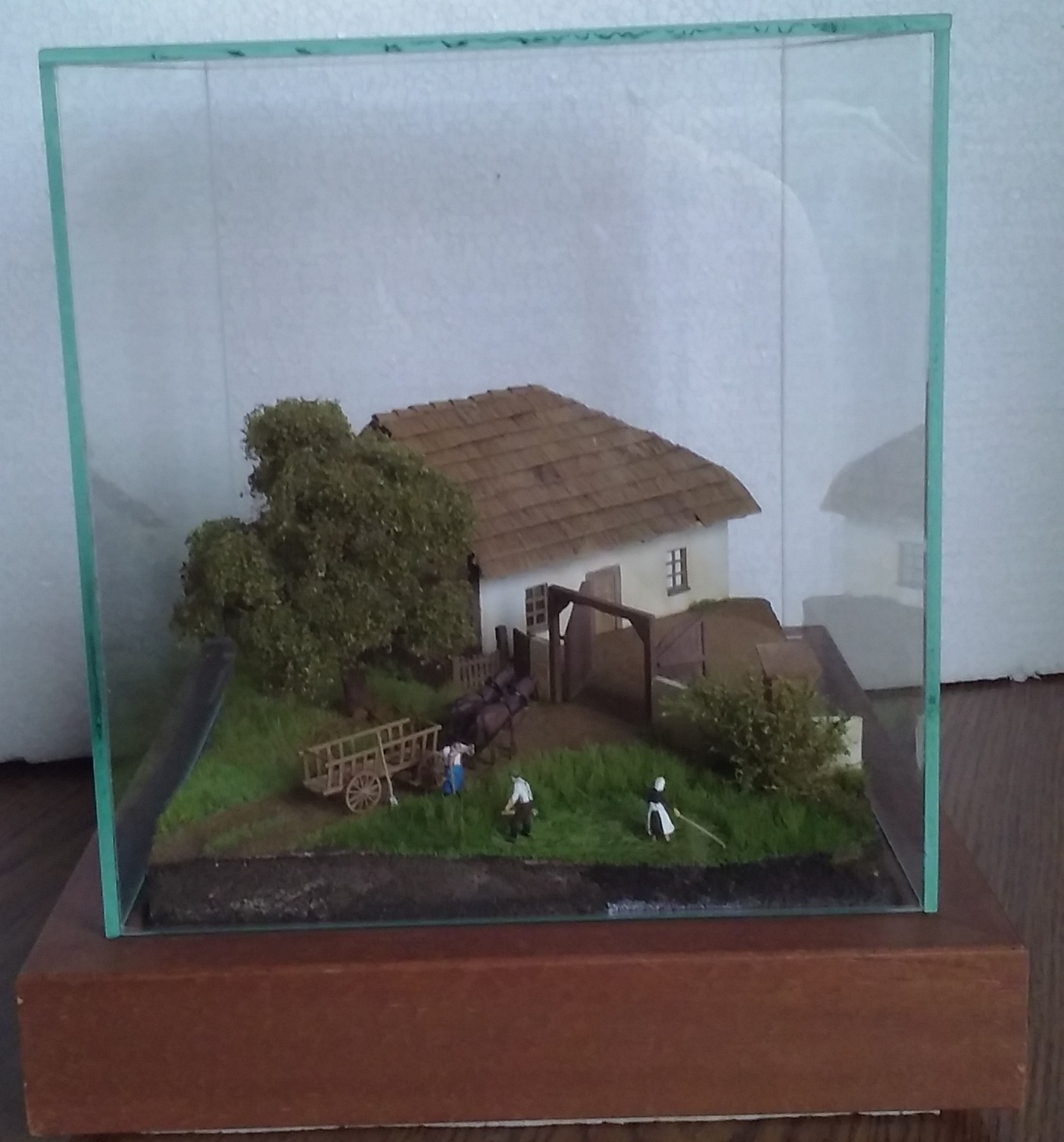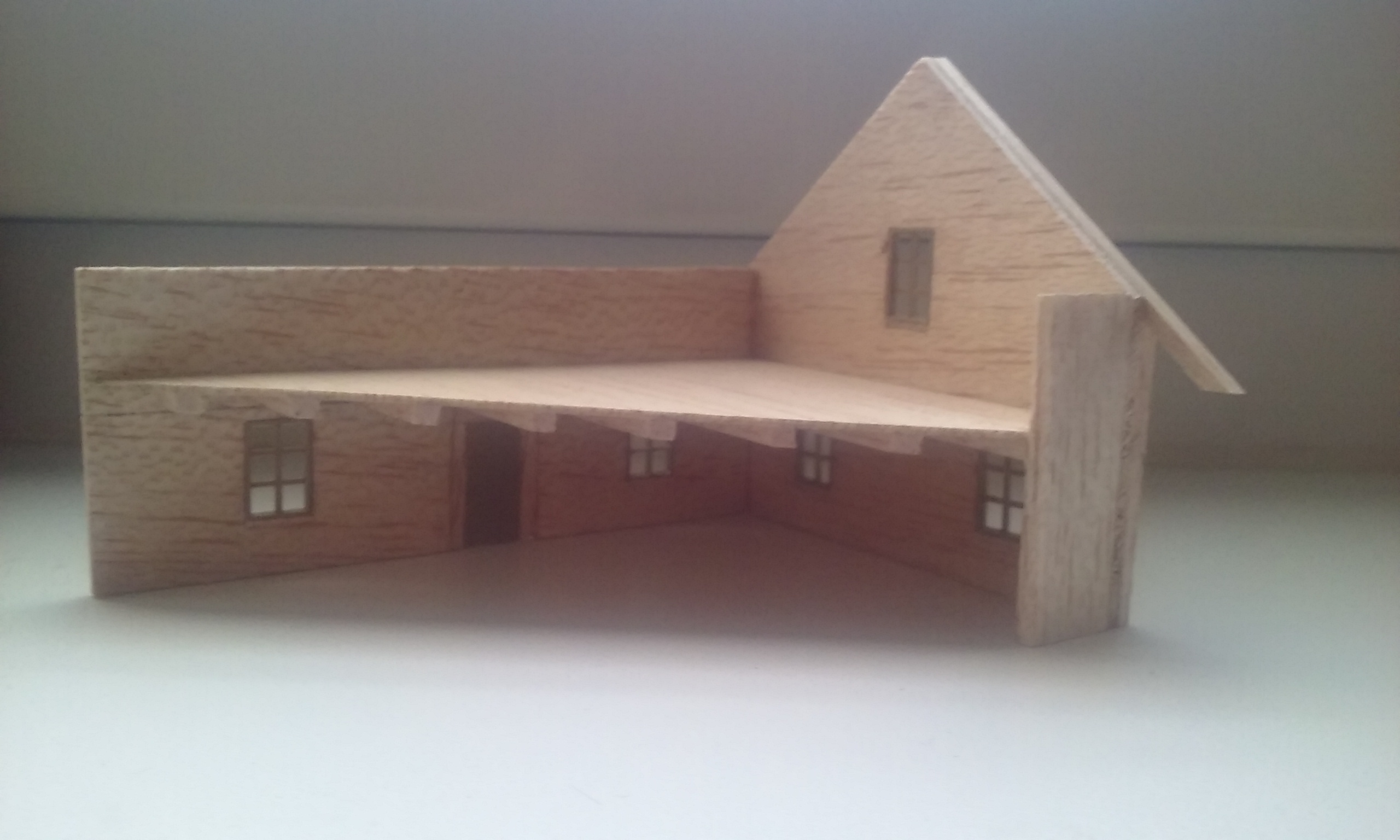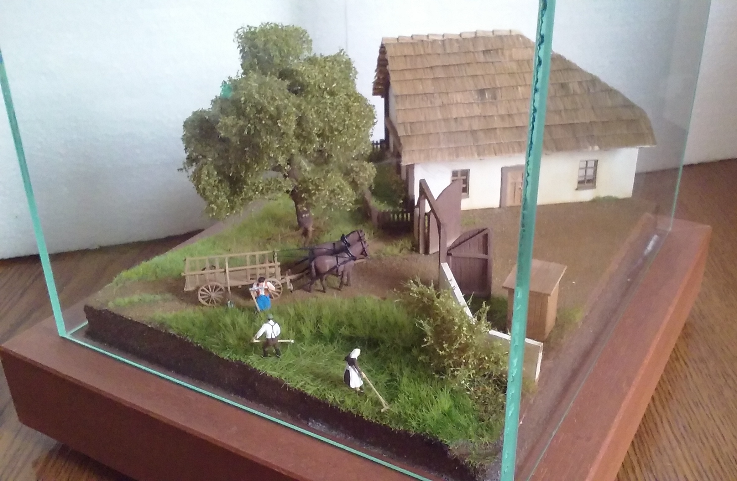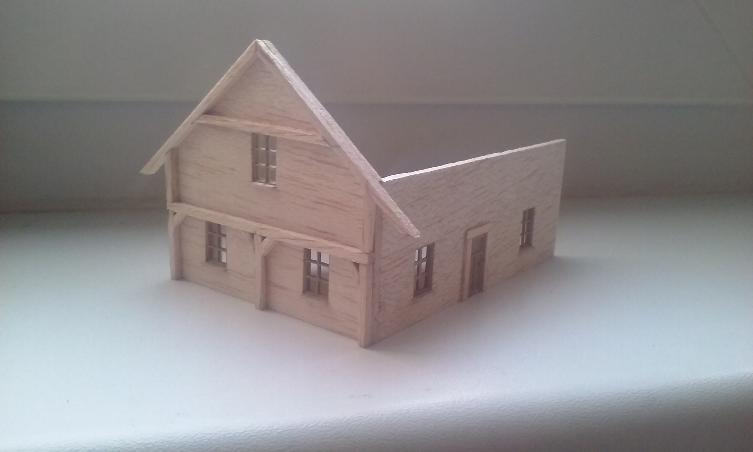 Největší piplačka byla nabarvit koně, jelikož mají již na sobě naznačený postroj. Po dokončení koníků a žebřiňáku jsem přešel na stavbu domu se slámovou střechou. Vzhledem k tomu, že se jedná o řez domem, musel jsem stavbu promyslet tak, aby bylo vidět vše s čím se u takového typu domu můžeme setkat. Takže krovy, kleštiny laťovky a podlahy se stropem plus jejich nosné trámy. Vše je ruční práce s pomocí balzové desky různých tlouštěk, skalpelu a úhelníku. Dokonce i trámy jsem musel zhotovit. Nejdříve tedy obvodové zdi a v nich otvory pro okna a dveře. Zprvu jsem chtěl postavit roubenku, ale po velkých komplikacích jsem nakonec usoudil že budova bude s omítkou a hrázdění na štítu bude dávat dojem omítnuté roubeky.