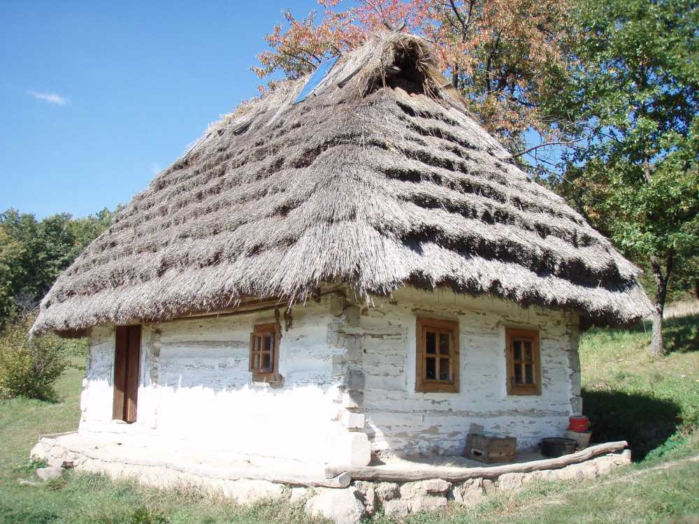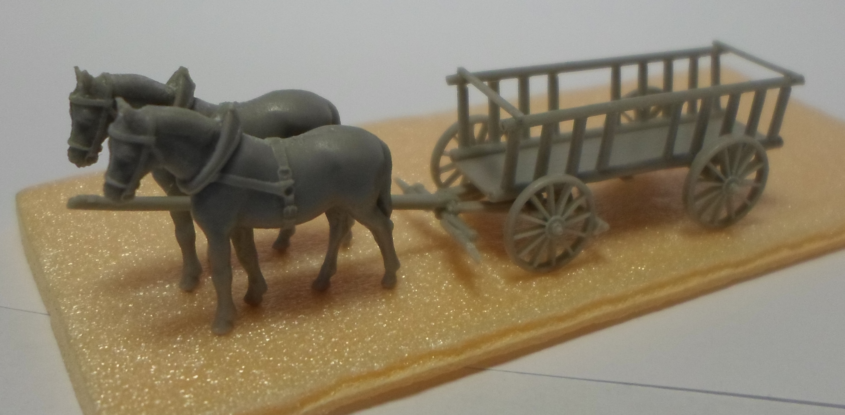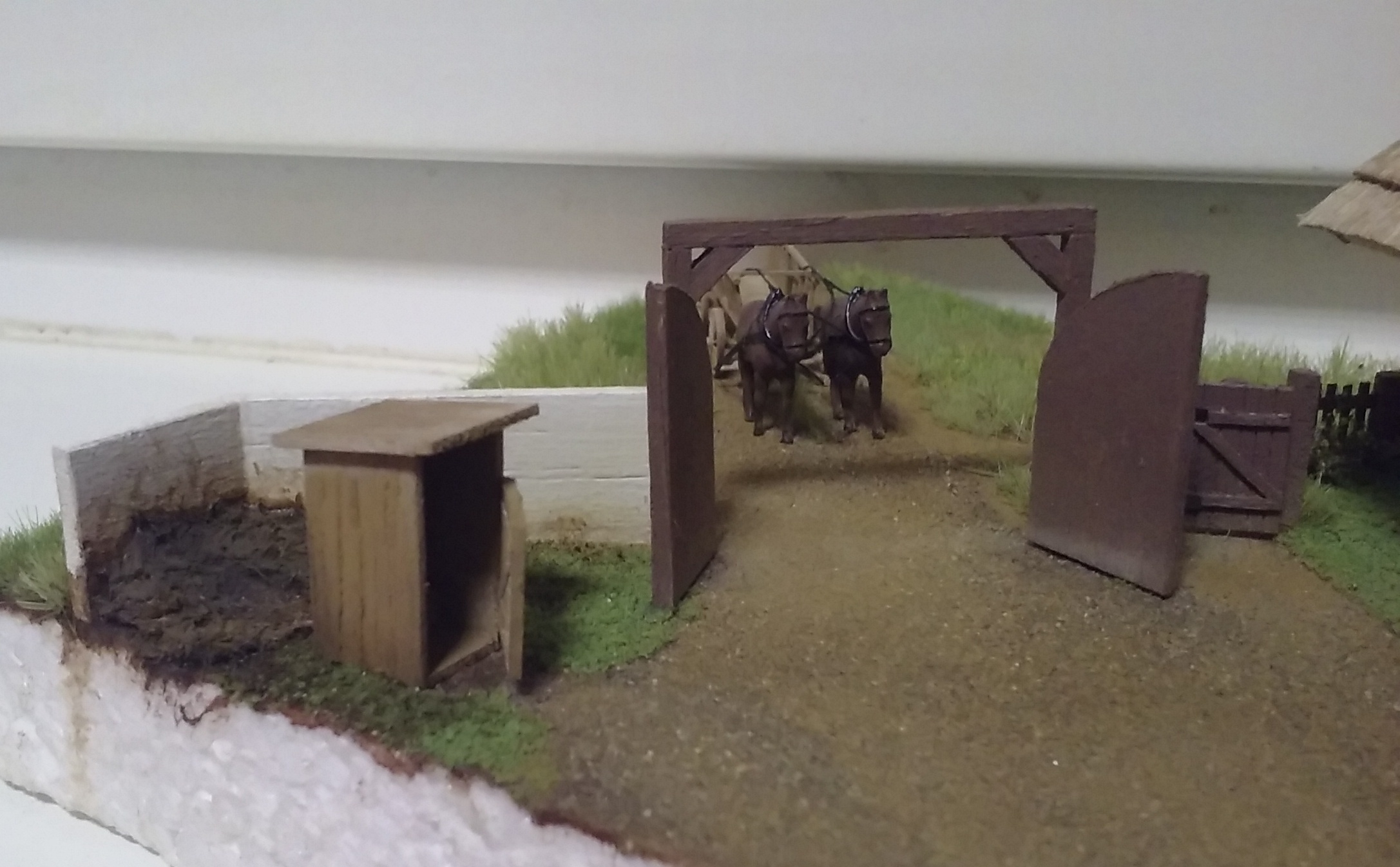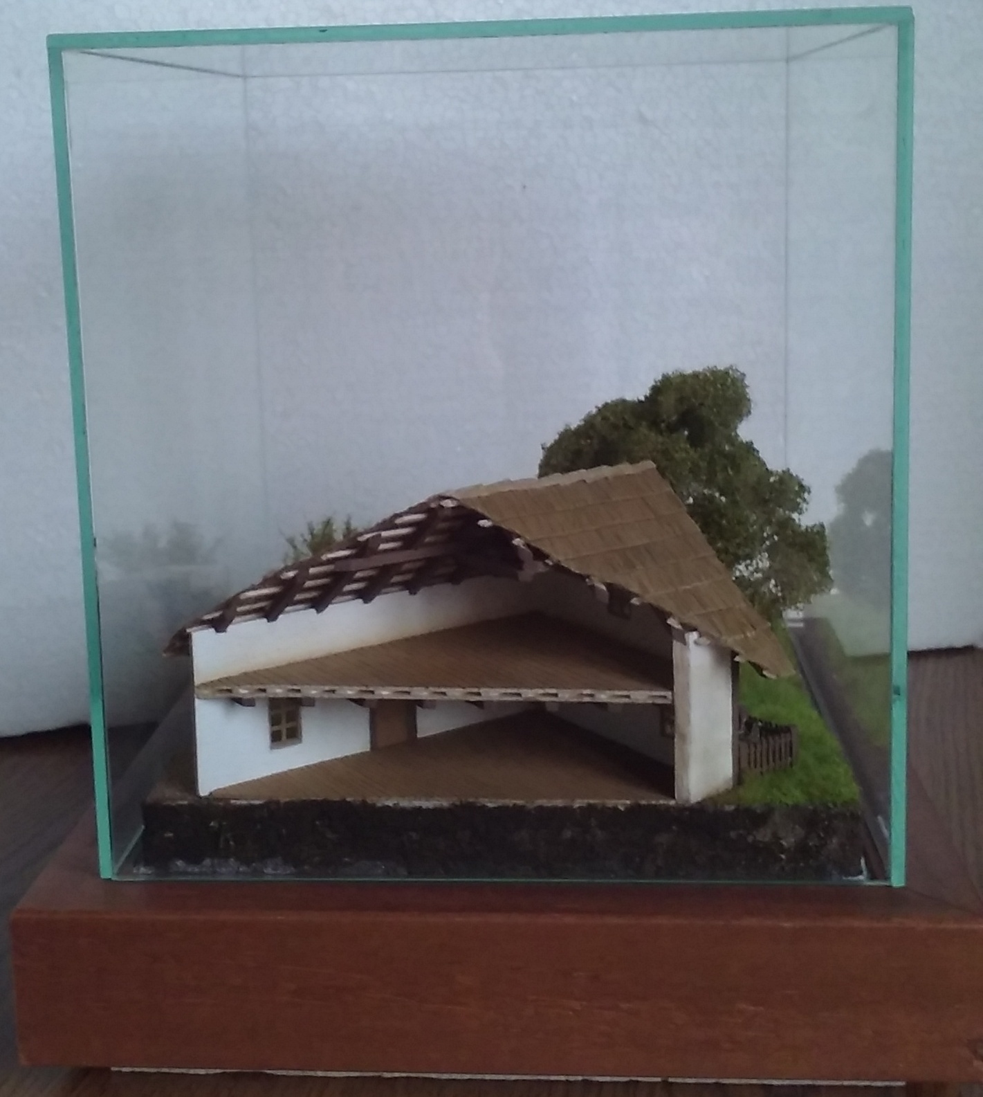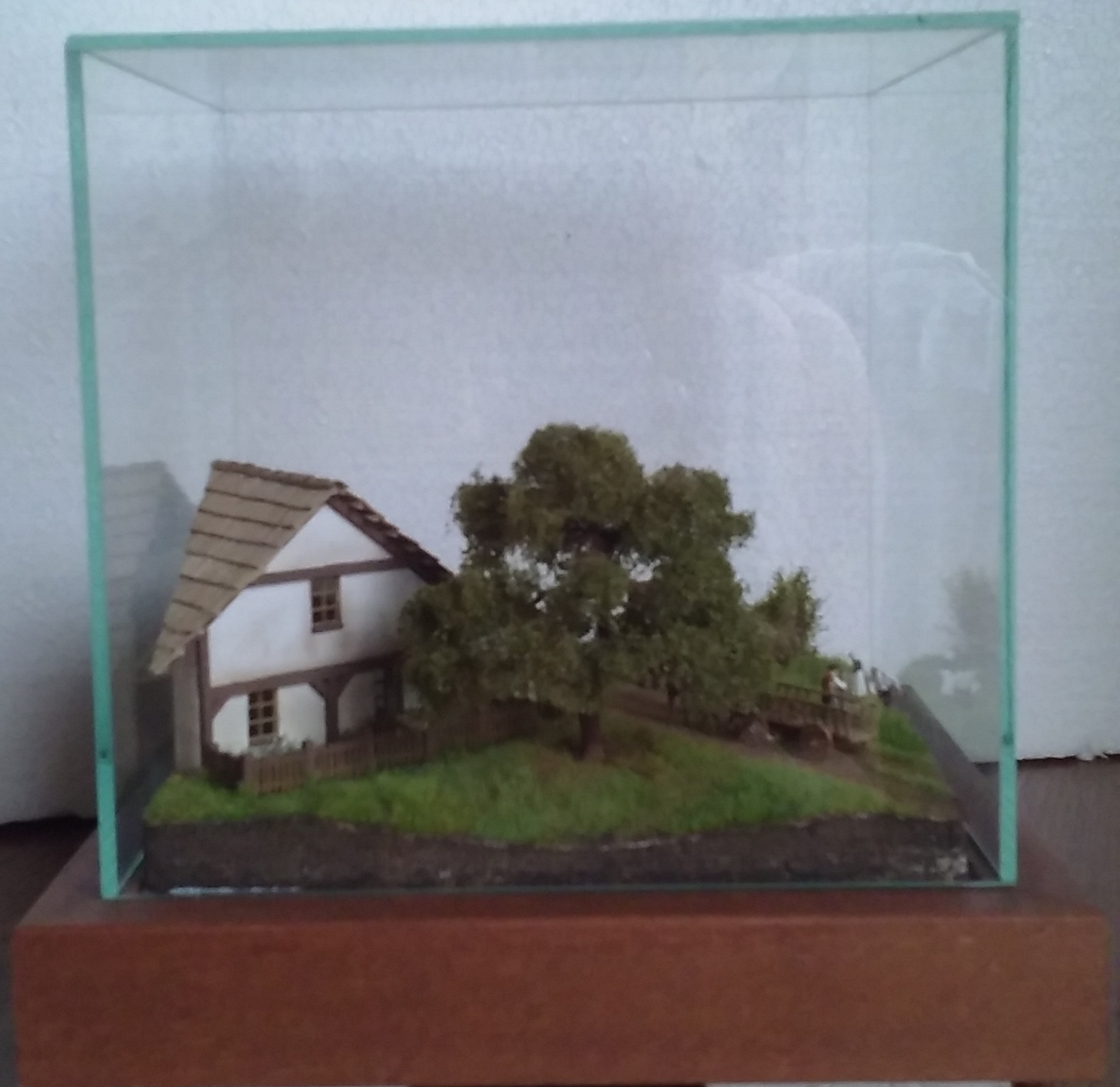 Největší piplačka byla nabarvit koně, jelikož mají již na sobě naznačený postroj. Po dokončení koníků a žebřiňáku jsem přešel na stavbu domu se slámovou střechou. Vzhledem k tomu, že se jedná o řez domem, musel jsem stavbu promyslet tak, aby bylo vidět vše s čím se u takového typu domu můžeme setkat. Takže krovy, kleštiny laťovky a podlahy se stropem plus jejich nosné trámy. Vše je ruční práce s pomocí balzové desky různých tlouštěk, skalpelu a úhelníku. Dokonce i trámy jsem musel zhotovit. Nejdříve tedy obvodové zdi a v nich otvory pro okna a dveře. Zprvu jsem chtěl postavit roubenku, ale po velkých komplikacích jsem nakonec usoudil že budova bude s omítkou a hrázdění na štítu bude dávat dojem omítnuté roubeky.