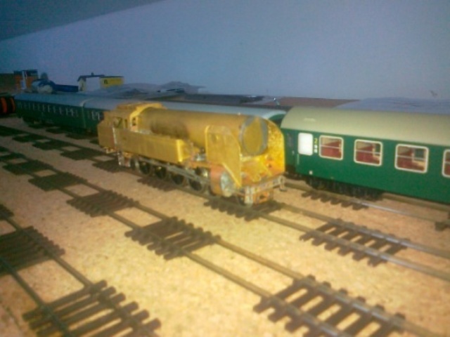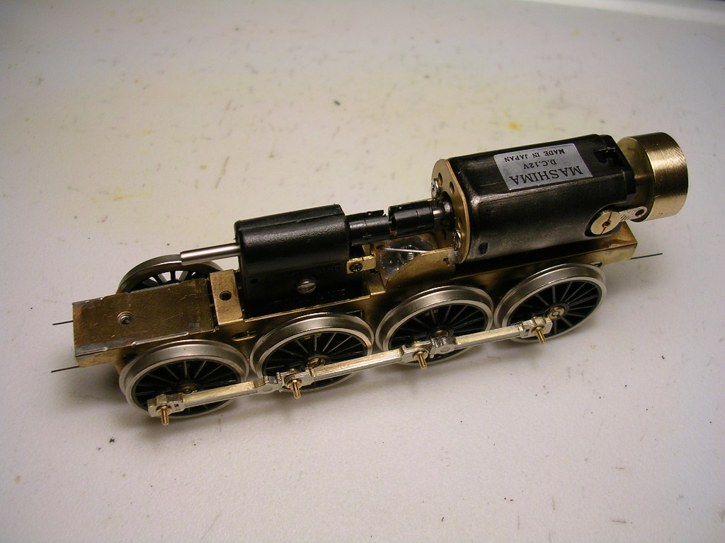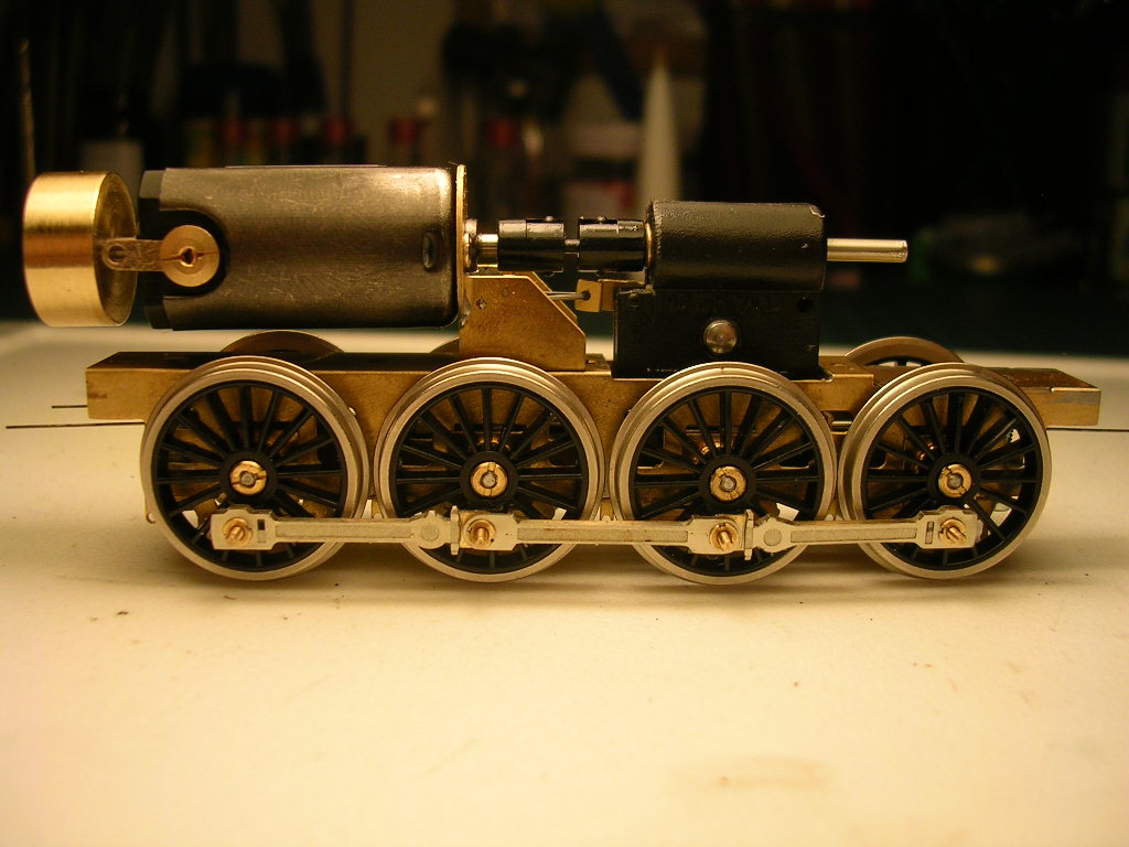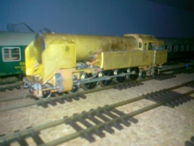 Podvozky s běhounyjsem musel zatížit těď jezdí bez problémů. Prostor rámu mezi osami běhounů zespodu (není tam vidět) jsem kompletně vyplnil olověnými plátky a zapájel. Proto zatím neuvažuju o pružinách proti rámu apod. I díky tomu je už teď je lokomotiva příjemně těžká a vlastně celá hmotnost kastle se přenáší na hnací dvojkolí. I tak uvažuju o dovážení (prostor pod dýmnicí, olověná podlaha v kabině apod.).