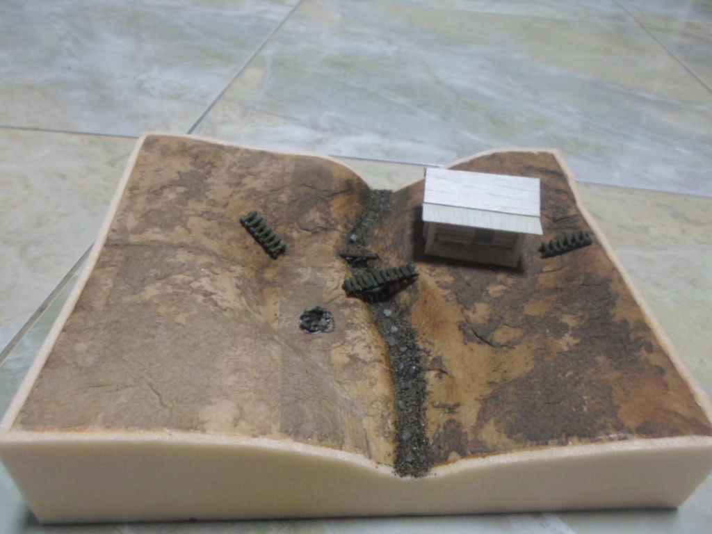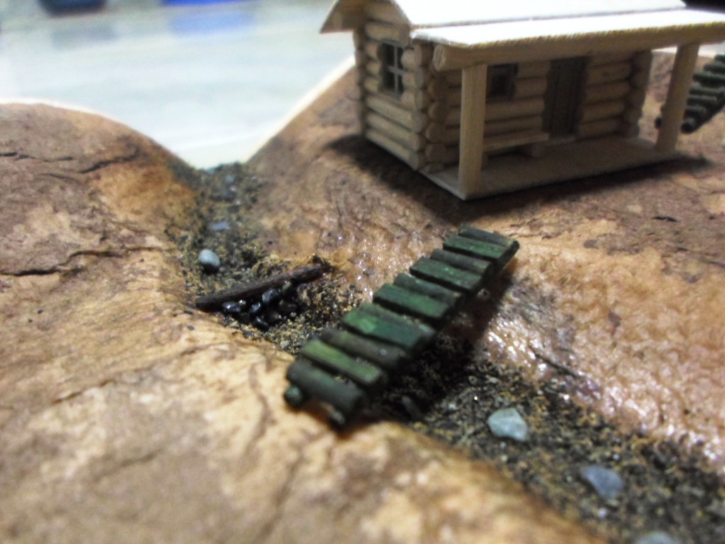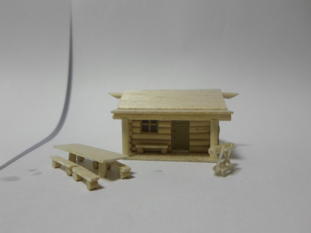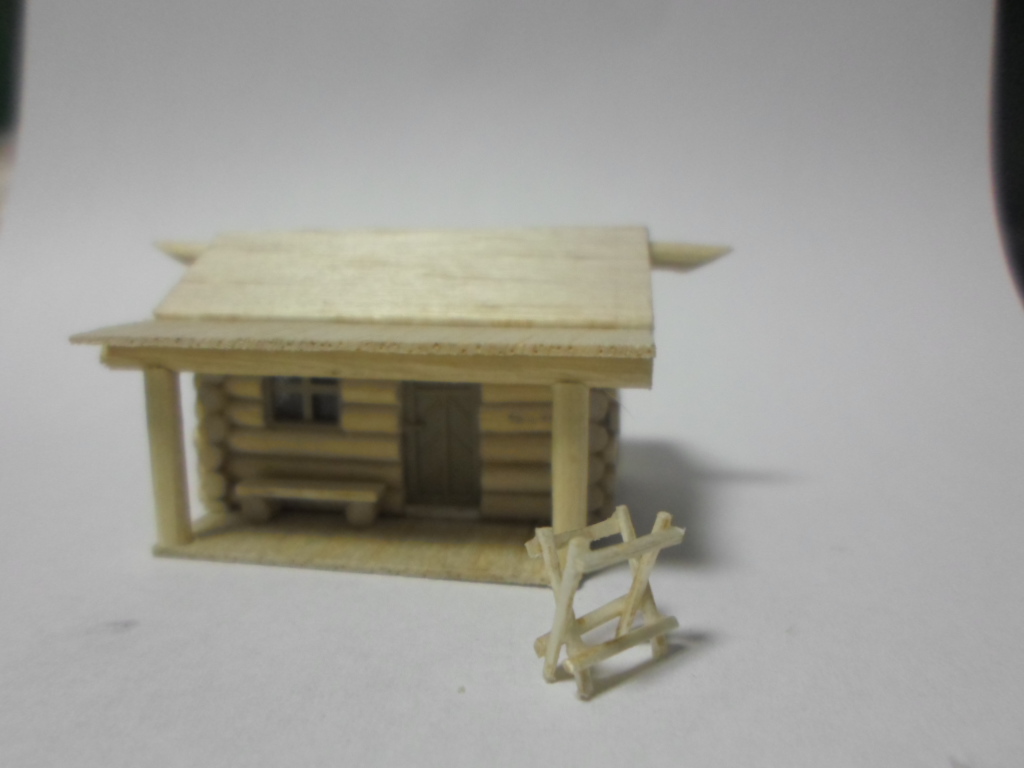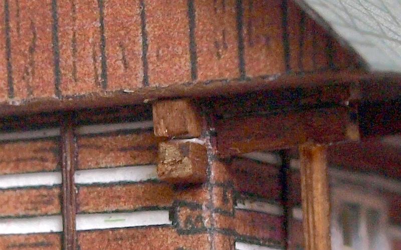slabší tránky na zdi je akrylovou barvou, rohové trámy pod střechou anilinovou barvou (jinak to jsou dřevěné hranaté profily 2x2 mm z nějakého modelářského krámku)