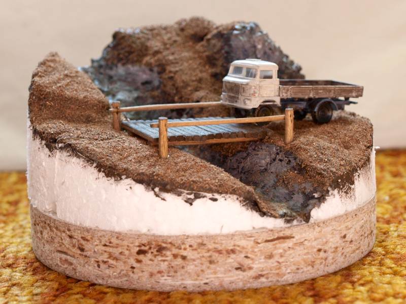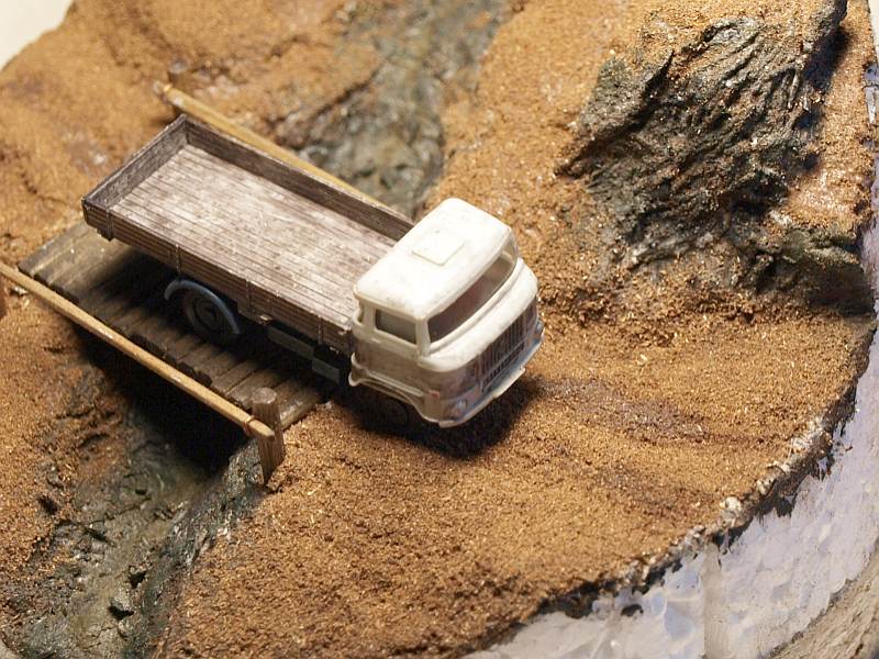 tak jsem po nočním schnutí druhé papírové vrstvy malinko pokročil, malinko sem zkusil plasticky upravit skalní povrch tak trochu alá břidlice (vtisknutím krátkých kousků nití do modelovací akrylové pasty, ale výsledek se ukáže až po důkladnějším zaschnutí) nahrubo se natřelo akrylovou barvou podloží a na nezaschnutou hnědou se nahrubo nasypal přesítovaný čaj (do míst kde bude spadané jehličí) pro lepší představu rozložení dioramatu ... zatím jen nasucho položený mostek (původně plánovaný pro jiné diorama), zábradlí zasazené do polystyrenu ... pro lepší představu celkové velikosti autíčko velikosti TT