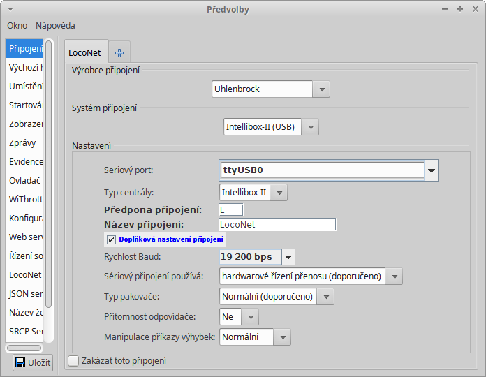 Připojení USB kabel. Parametry připojení: Uhlenbrock - Intellibox-II (USB) - Intellibox-II