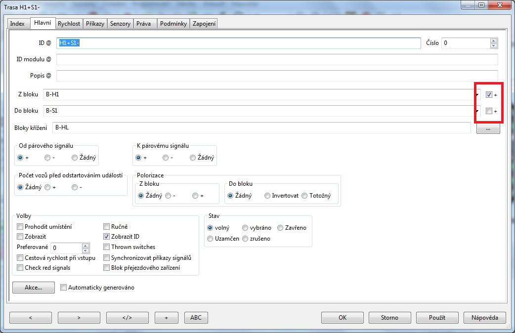 a) Trasa1 = vlaková cesta z Blok1 (Zatrženo +) do Blok2 (Zatrženo +)
