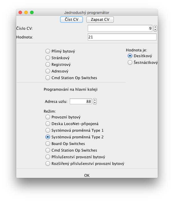 Jestli jsem to pochopil správně, tak používáš dekodéry MGP. Jsou to skvělé dekodéry. Není nutné/vhodné často měnit koncepci řešení řízení kolejiště. Nakoukl jsem do manuálu a dekodéry MGP se dají snadno přeprogramovat tak, aby výhybky měly zpětný ohlas ONESENSOR. Místo tlačítek se k dekodéru připojí mikrospínač od serva/přestavníku. Tlačítka se přeprogramují na zpětný ohlas. Pro programování dekodéru se použije JMRI Programátor jednotlivých CV v nastavení viz obrázek. Je potřeba mít verzi JMRI 4.20. Do aderesy uzlu se zadá LNSV adresa dekodéru. Do CV se zadává SV podle manuálu.