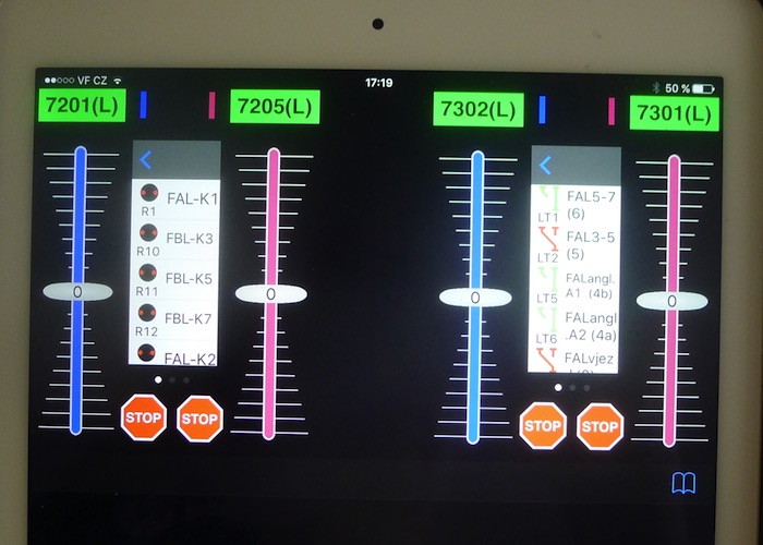 Postup pro ovládání centrály z mobilu nebo tabletu popsal sidlo na https://sites.google.com/site/sidloweb/ ... withrottle. Použivatelé zařízení Apple si na rozdíl od EngineDriver jak popisuje sidlo stáhnou z App Store aplikaci WiThrottle. Na mobilu nebo tabletu zvolí síť centrály DR5000 a v aplikaci WiThrottle do pole Configure zadá ID jak popsal sidlo. Aplikace WiThrottle nabízí poněkud bohatší volbu ovládacích panelů než Engine Driver, v případě tabletu lze ovládat až čtyři lokomotivy v nastavení pro pohodlný posun, kdy mají posuvné regulátory rychlosti nulu uprostřed, není tedy potřeba přepínat směr jízdy.