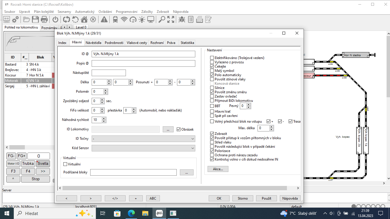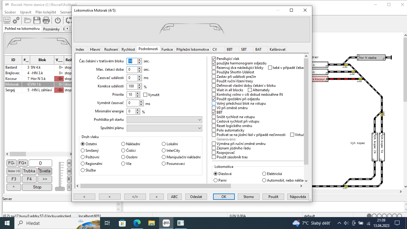 Složitější je to ve stanici, kde chceme aby zastavoval jen nějaký typ vlaku. Pak opět ve vlastnostech bloku na kartě Podrobnosti jsou dole typy vlaků. Zde jsou tzv. 3stavová tlačítka. Běžné zaškrtnutí typu vlaku způsobí zastavení v bloku podle nastavené doby čekání v bloku, při druhém kliknutí se objeví čtvereček, který způsobí, že daný typ vlaku do bloku smí vjet, ale nebude zde zastavovat (opět pokud má možnost jet dál bez zastavení) a třetí stav - nezaškrtnuto znamená, že vlak daného typu vůbec do tohoto bloku nesmí vjet. Samozřejmě to předpokládá i správné nastavení typu vlaku ve vlastnostech lokomotivy. Má to ještě nějaká další úskalí, ale tím bych se nyní nezabýval.