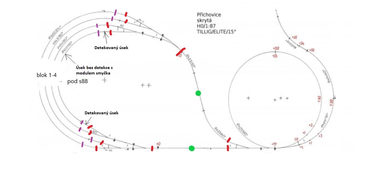 Střední úsek bloku bude sloužit k přepínání polarity, může být bez detekce a bude na něm modul smyčka.