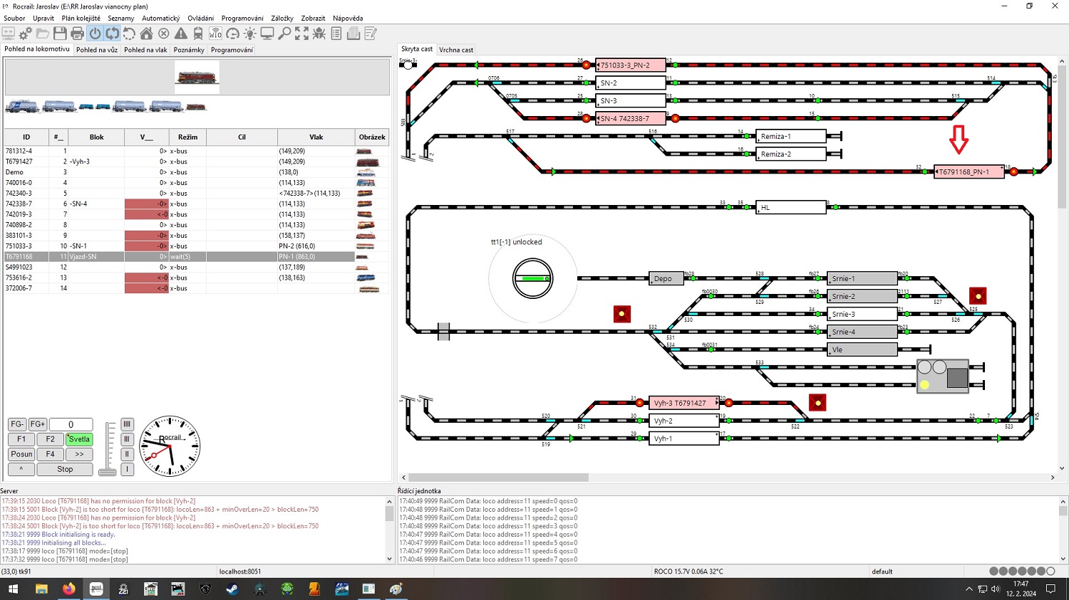 Vie mi niekto poradiť že pri ručne vytvorenej vlakovej cesty u mňa z bloku " Srnie3 do Vjazd-SN cez blok Vyh2 " vlak prejde celú trasu a pri dosiahnutí bloku nepokračuje ďalej ale zastaví a smerová šípka sa zmení a musím ručne vo vlastnostiach Bloku zmeniť " Prehodiť vstupnú stranu bloku",potom vlak pokračuje ďalej