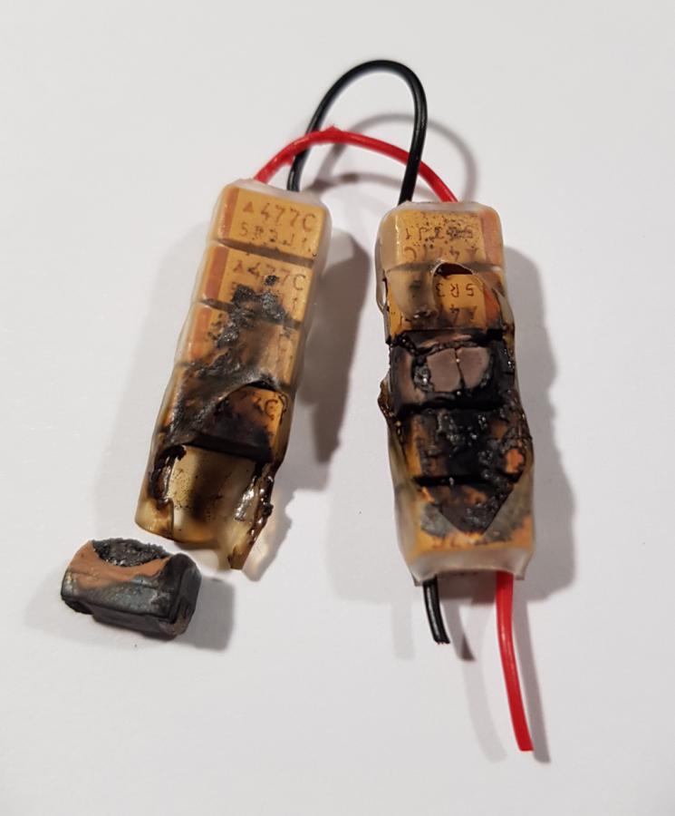 Tady si dovolím ukázat jednu fotku z MRH. Je to taková ukázka, proč nedělat power pack pro DCC z kondenzátorů na 16V. Přesně to uživatel popisuje - zajímavé je, že to nějakou dobu spolehlivě fungovalo :)