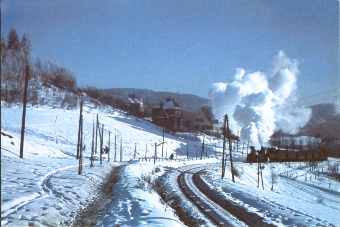 Lyžařský vlak :lol: právě absolvoval úsek dvojité Abtovy ozubnice o největším sklonu 122‰ na 1,6 km dlouhé dolnosaské malodráze St. Andreasberg West - St. Andreasberg Stadt a vjíždí do koncové stanice.