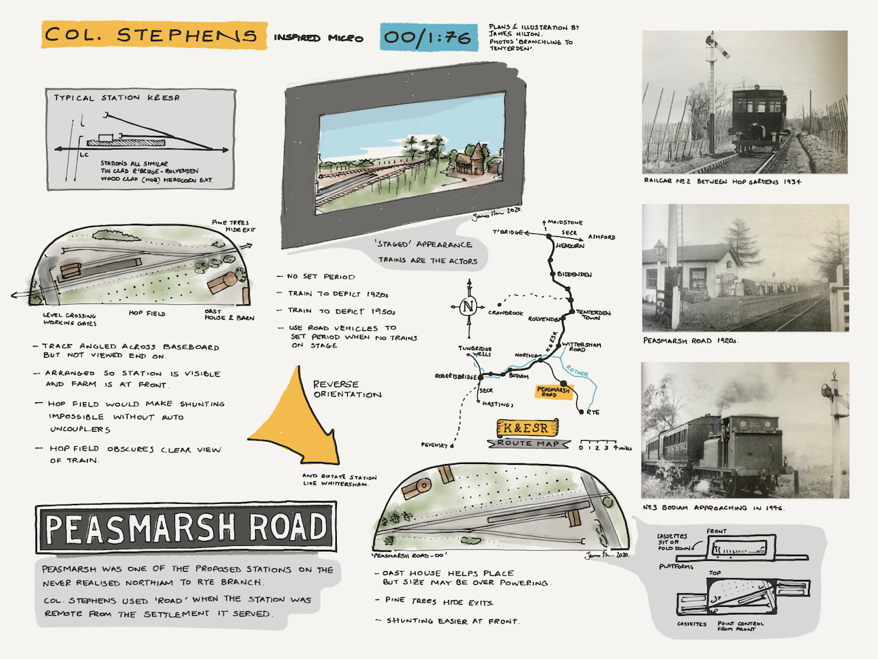 Britský modelář James Hilton se dlouhodobě zabývá projektováním minikolejišťových jevišťátek typu cameo z anglosaského prostředí (z nichž lze většinu s trochou invence snadno poevropštit nebo rovnou počeštit) a protože je zároveň profesionální kreslíř a ilustrátor, své projekty doprovází sympatickými sériemi kresbiček včetně scénografických poznámek, možností organizace provozu apod. Většinou pracuje ve velikostech 00 nebo H0. Jeho stránky nebo spíš blog se spoustou plánků a fotografií najdete tady: