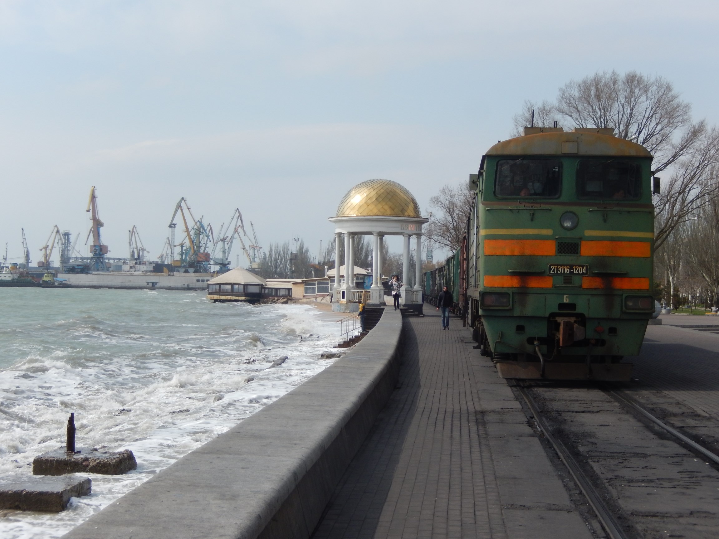 Kuriozita z města Berďjansk. Nákladní vlaky tady jezdí po pobřežní promenádě.