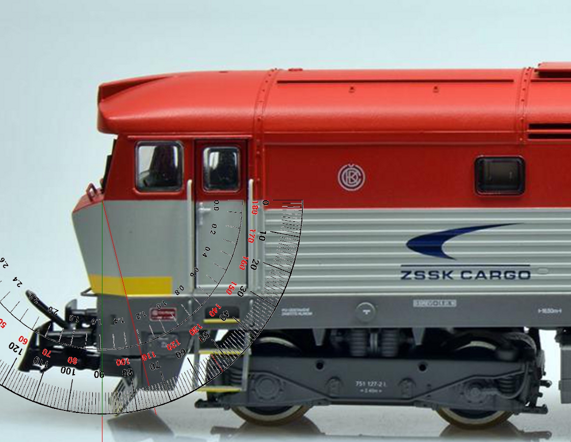 Aleson: když není osa focení přesně kolmá ke špici čumáku, to může mít za těchto podmínek vliv tak v řádu minut. Horší je to s tou velmi nekvalitní fotografí modelu. Ale jo, 6° chyba na hraně 1 metr dlouhé, což udělá na každé straně lokomotivy 104.5mm, to je v modelářské toleranci… Nebo třeba 7° :twisted: Další nepřesnost, které si nikdo nevšiml je, že špice čela ve skutečnosti není rovnoběžná s hranou prvního bočního zalomení. Dole je špice více vpředu. Proto je ta chyba tak extrémní. Vlastně pardon, v normě :D