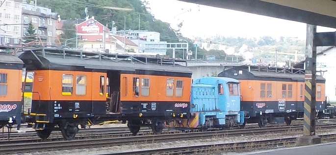 odstavená souprava je na první pohled nenápadná, na druhý zaujme "prasátko" uprostřed soupravy (jak lokomotiva v obrněném vlaku) a pak si člověk všimne, že je vidět skrz některé vozy v poněkud větší míře, než bývá obvyklé...