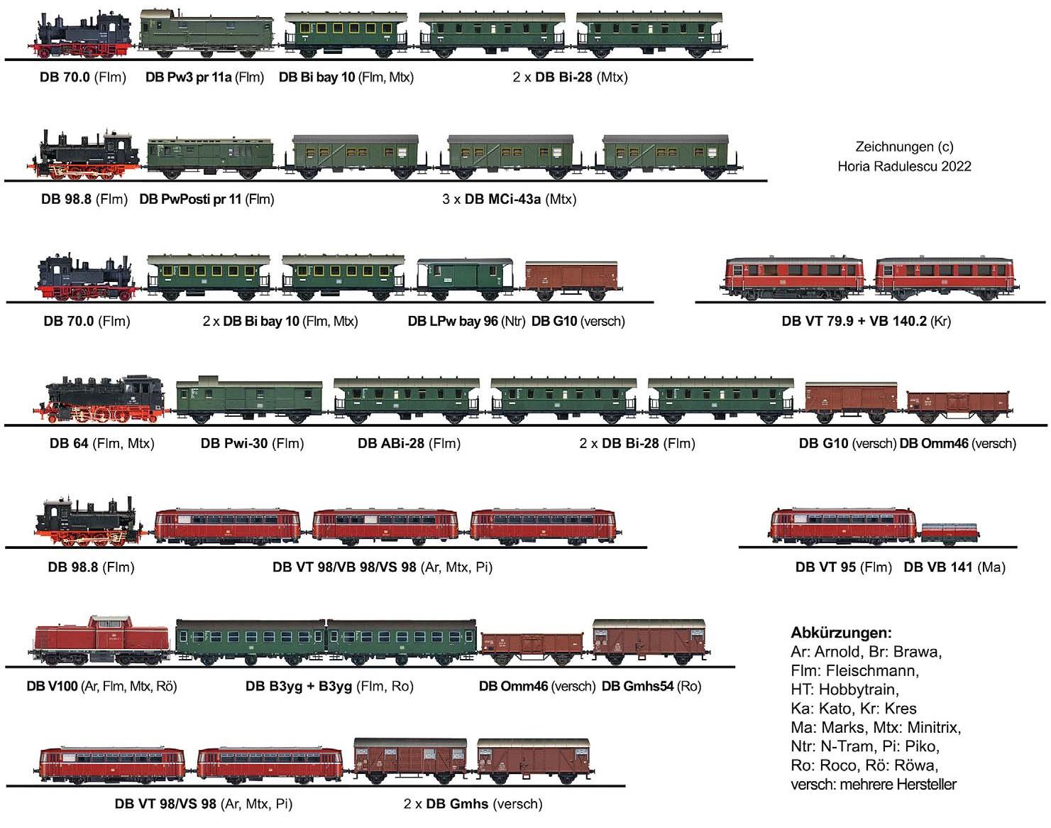 V nejnovějším čísle německého dvouměsíčníku N-Bahn Magazin je už pátý díl článku o bavorských lokálkách. Jeho součástí jsou obrázky znázorňující typická složení lokálkových souprav DB v této spolkové zemi (kde byla hustota lokálek po většinu 20. století srovnatelná s Čechami) v epochách III a IVa (které Němci považují za zlatá léta DB) a zároveň sdělující, kdo vyráběl/vyrábí modely příslušných vozidel.