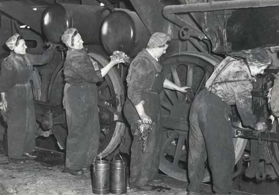 Na prvním snímku je Putzbrigade Günze z dnes už zrušené služebny Bw (tj. lok. depa východoněmeckých DR) Berlin Pankow-Heinersdorf. Skupina žen čistí parní lokomotivu. (Na pohled mašina vypadá jako dvaapadesátka.) Pod snímkem z roku 1957 je komentář, který stručně uvádí pracovní postup: Nejdřív špachtle a škrabky, pak střička s horkou vodou, osušení tlakovým vzduchem a nakonec pucvól napuštěná vyjetým olejem. Důležité však je nevyřčené: Takhle nejčastěji vypadala každodenní realita práce, kterou si vydělával na živobytí nový socialistický člověk.
