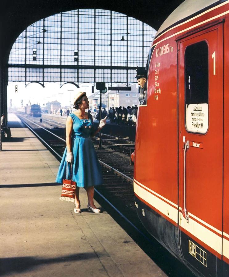 Druhý snímek, pro změnu barevný, což tehdy ještě nebyla úplná samozřejmost, je evidentně naaranžovaný reklamní záběr z roku 1958. U nástupiště v žst Hamburg Altona stojí připravena k odjezdu třídílná motorová jednotka VT 08.505 DB z roku 1952 (proudnicovým tvarem čela si vysloužila u západoněmeckých železničářů přezdívku Eierkopf - jak to přeložit? nejspíš nějak jako vejcohlav, protože jiné možné významy i jejich překlady jsou hanlivé, přinejmenším určitě pro vozidlo, které bylo tehdy na špici technické úrovně a vozilo ty nejprestižnější vlaky), která povede motorový expres (dnes bychom asi řekli vlak vyšší kategorie) FT 42 "Senator" do Frankfurtu nad Mohanem. Mladá dáma v nebesky modrých letních šatech, apartním kloboučku a bílých rukavičkách dlí v srdečném rozhovoru se strojvedoucím na stanovišti řídicího vozu, přičemž její pletená kabelka, jistě jenom čistě náhodou ve firemních barvách motorové trakce DB, dokonale ladí s nátěrem vozu. Ze záběru dýchá dobový optimismus. NSR už se vyhrabala z nejhorších poválečných trosek, hospodářský zázrak se právě rozjíždí na plný plyn, loni se NSR stala členským státem EHS, životní úroveň stoupá a generace mých rodičů, které tehdy bylo něco kolem třicítky, má před sebou celý dlouhý a skvělý život. (Je nicméně nutno podotknout, že podobně laděné snímky známe i z našeho prostředí - viz atmosféru kolem světové výstavy EXPO 58 v Bruselu, kde československá expozice sklidila zasloužené uznání. Ve společnosti tehdy převládaly všeobecně optimisticky laděné pocity na obou stranách železné opony.) Berlínská zeď ještě nestojí a karibskou krizi si nikdo ještě neumí ani představit, president J.F. Kennedy prohlásí své slavné "ich bin ein Berliner" až za 5 let, několik měsíců před Dallasem, vietnamská válka ještě nezačala a osmašedesátý a Woodstock ukončí tuto výjimečnou dobu ještě za dalších 5 nebo 6 let. 10 let v životě třicátníka je pořádně dlouhá doba; generace mých rodičů, do které nepochybně patří i ta mladá žena na snímku, na ni koncem života bude vzpomínat jako na zlatá 60. léta...