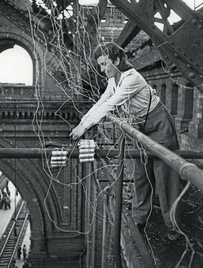 Střelmistrová Hertha Barth instaluje nálože a zápalnice do ocelové konstrukce střechy nádražní budovy těžce poničené spojeneckým bombardováním v únoru 1945. Konstrukce byla odstřelena 22. srpna 1946.