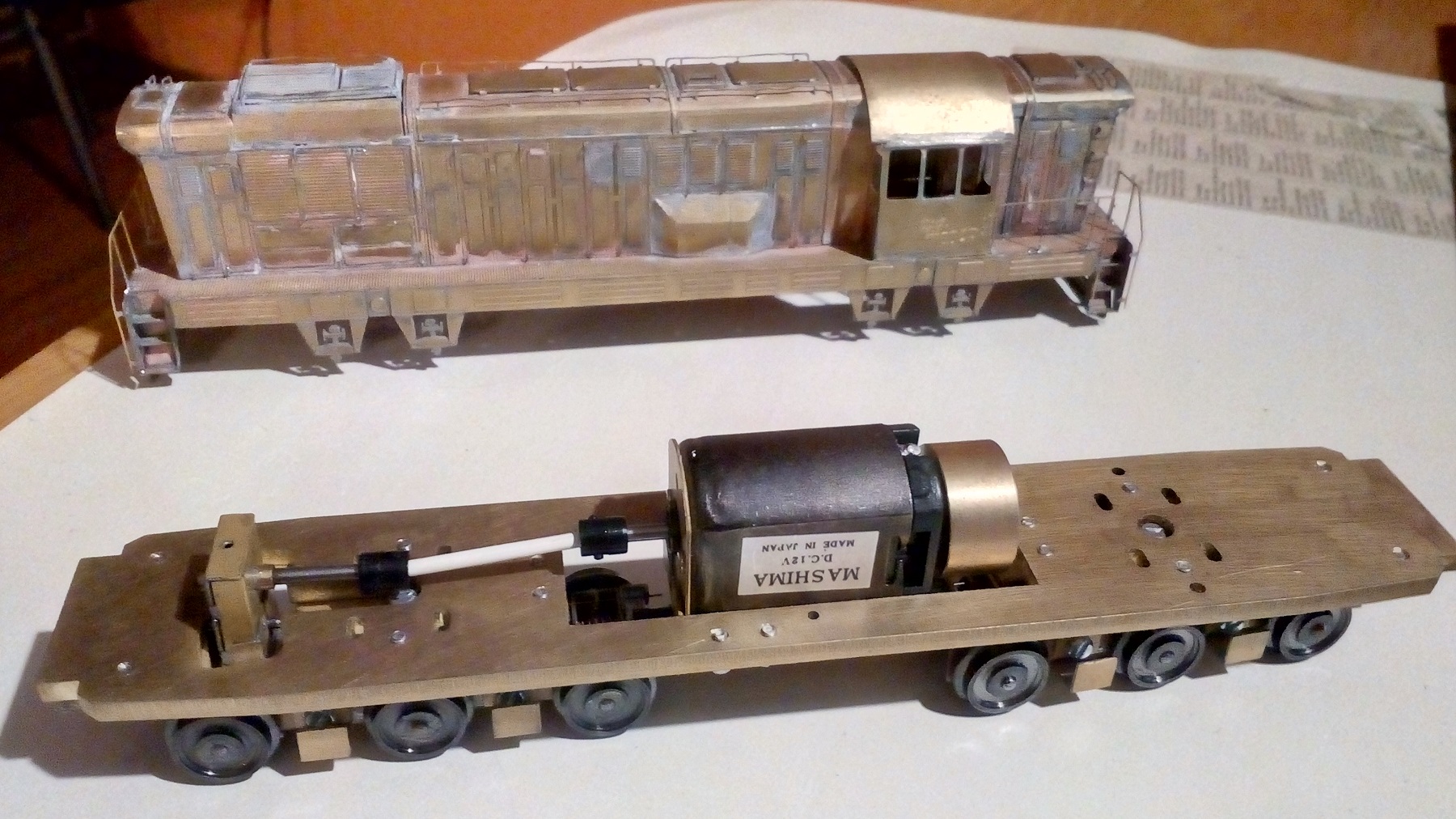 Pojezd má hlavní rám z 2 x 3 mm mosazi vypalované laserem, převodovky a rámy podvozků z leptu (0.5 mm mosaz), převody mosaz/plast Tenshodo a ALS, motor Mashima 1830 se setrvačníkem a nově sběrače proudu leptané z bronzu 0.1 mm. Fotonávod je zde