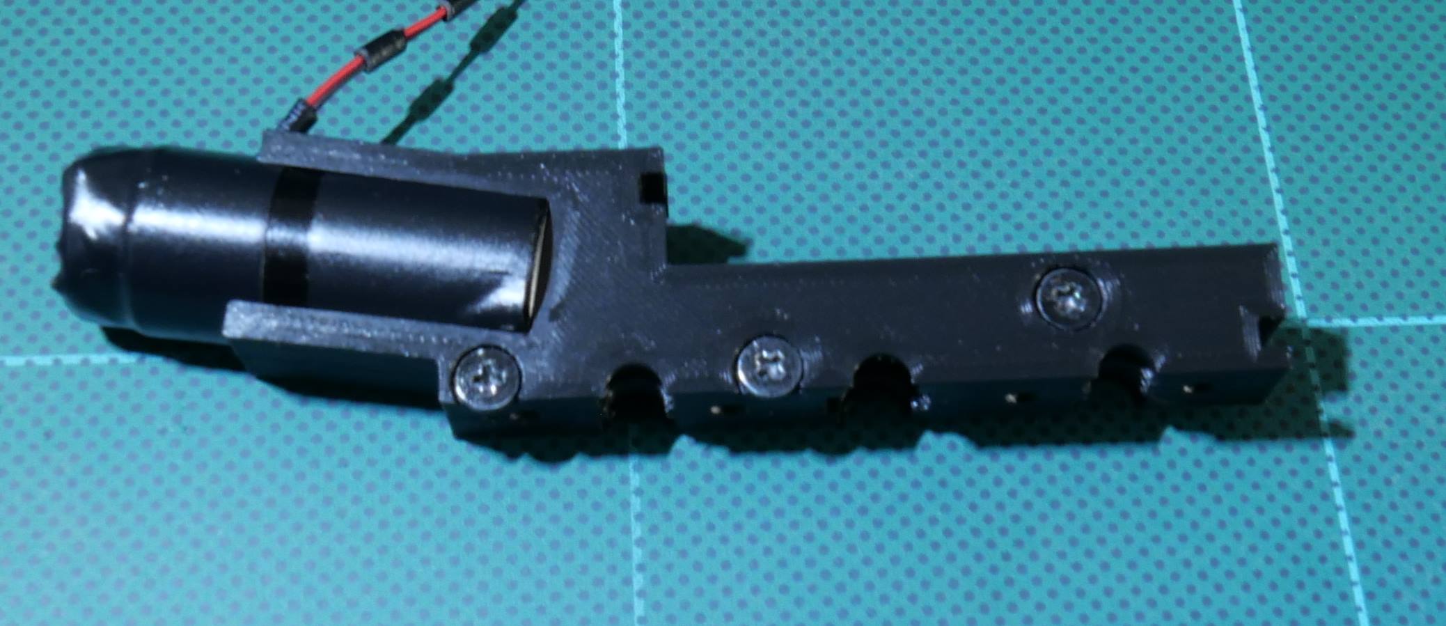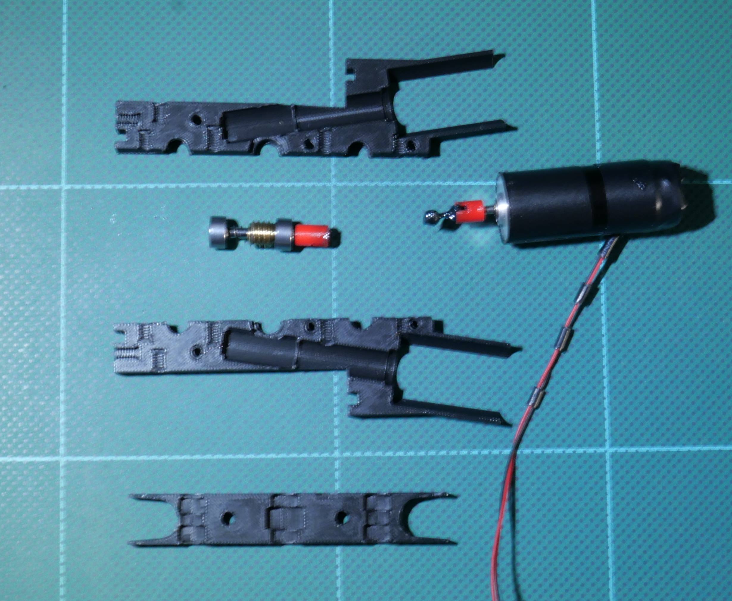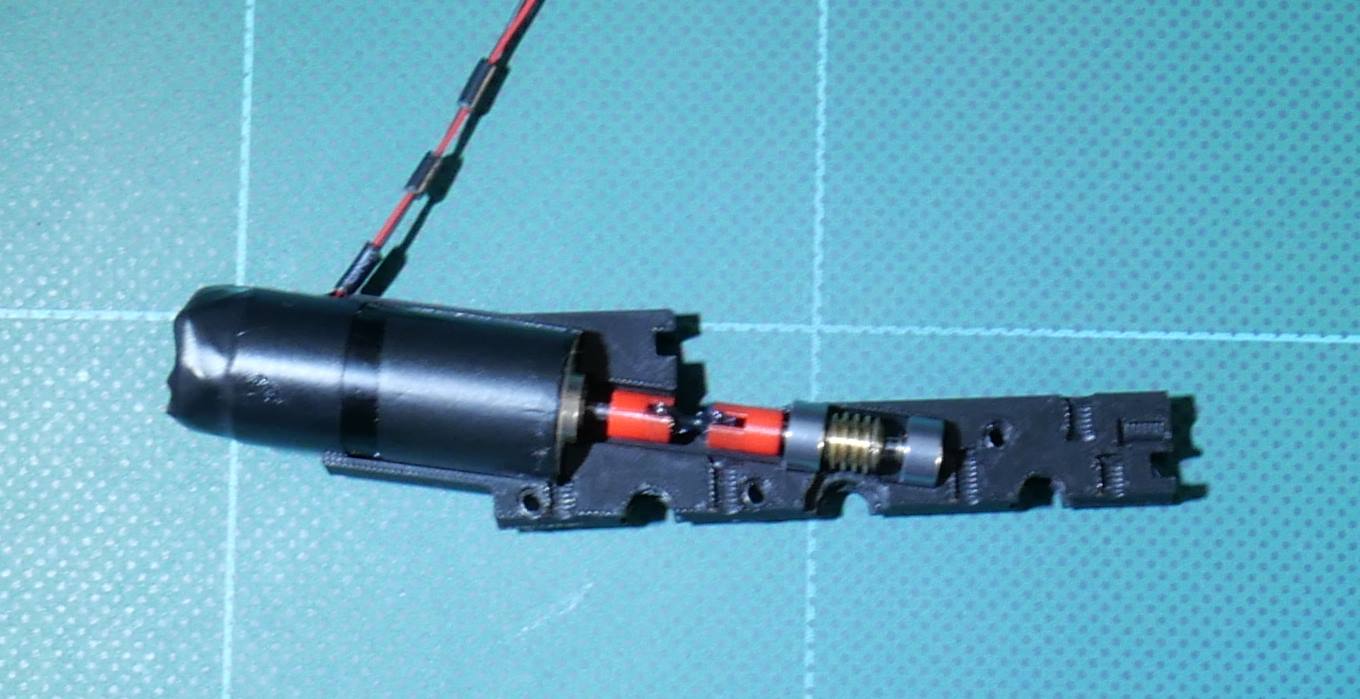 K pohonu jsem použil bezjádrový 5 pólový motor z Číny. Po vyzkoušení mnoha verzí převodů jsem skončil u přímého převodu s jednochodým šnekem.