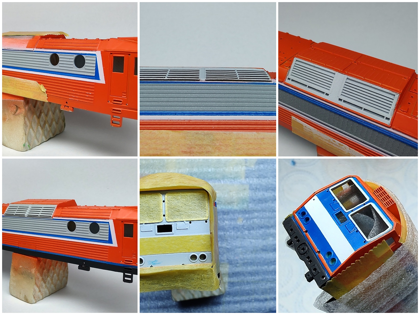 - Přelepit celé čelo, vymaskovat tvar na bočnici (celý lichoběžník včetně bílé) a střešní žaluzie a stříknout vše oranžovou. Je to takto lepší, páska se opře pod okapničky, až pod ně je to bílé, snadno se dodrží rovinnost hrany. Pozor - jiný kus pásky přijde na zvlněné bočnice, jiný na úkosy. Na bočnici se totiž páska "omotá" okolo vlny a v úkosu by vyšla jinam. Je potřeba to dobře navázat. Boky odlepit.