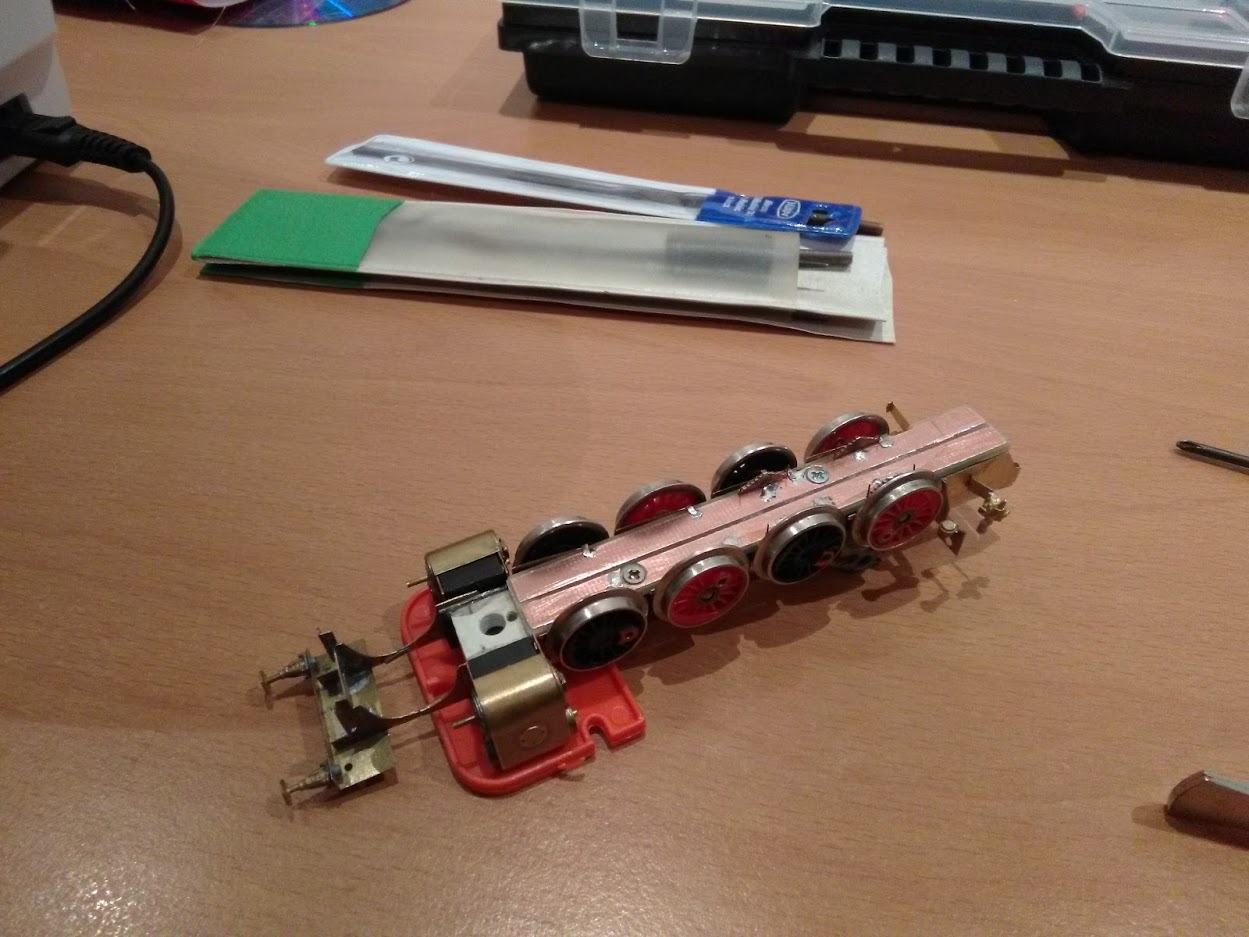 Přiletoval jsem sběrače z fosforbronzu a došlo i na osazení spodních pružnic 3. a 4. dvojkolí. Sběrače pracují v oblasti hrany kuprextitové destičky, takže zatím žádný zkrat nehrozí. Škrábe to a dělá to kravál. Bude to chtít v každém sbíracím plíšku udělat rýsovací jehlou bouli, aby kontaktní plocha byla kulatá a tolik to nedřelo.. Nu uvidím jak tenhle víkend. Jinak mi dorazil dnes AG1, tak se těším na chemický pokusy :-D