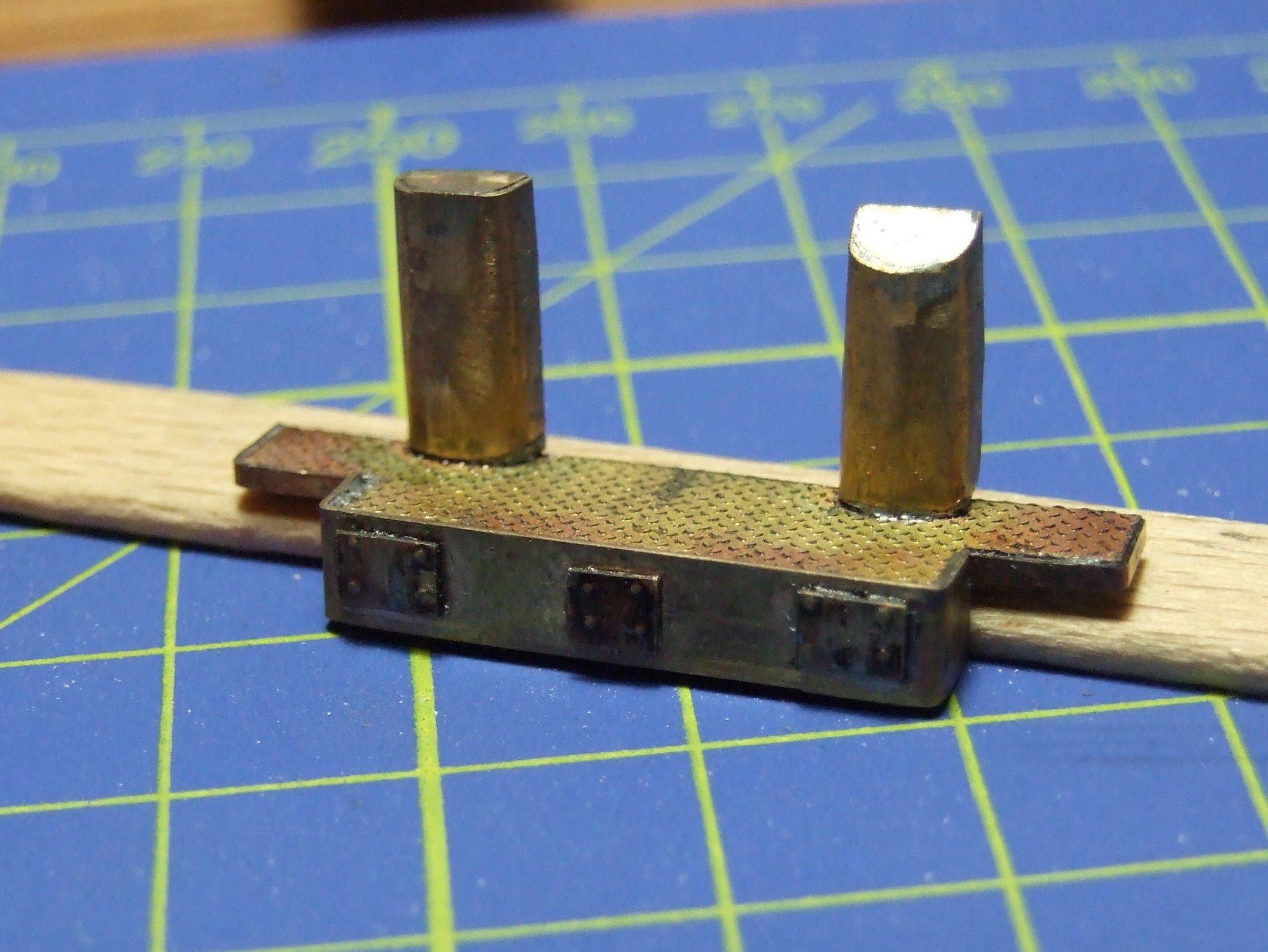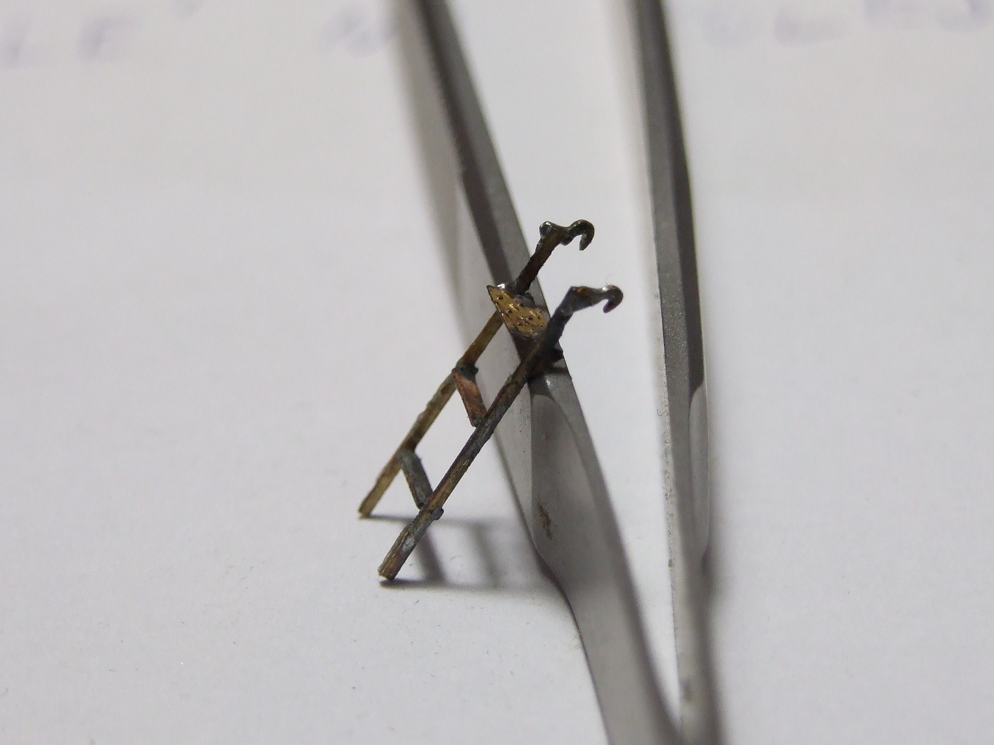 Jako takový bonus přikládám fotky již vyrobeného čelníku a žebříku který přijde zavěsit na madlo u ochozu z levé strany. Všechno je vyřezaný a sletovaný z kusu mosaznýho plechu. Ten žebřík byl na zbláznění, když hrot pájky je pomalu jednou tak velkej :lol: