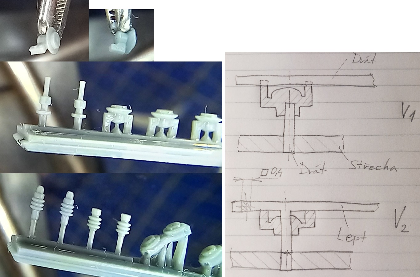 Měl jsem původně v plánu verzi 1. Zasunout drátek do díry ve střeše, na něj nasadit izolátor a na jeho pacičky přilepit drátek.