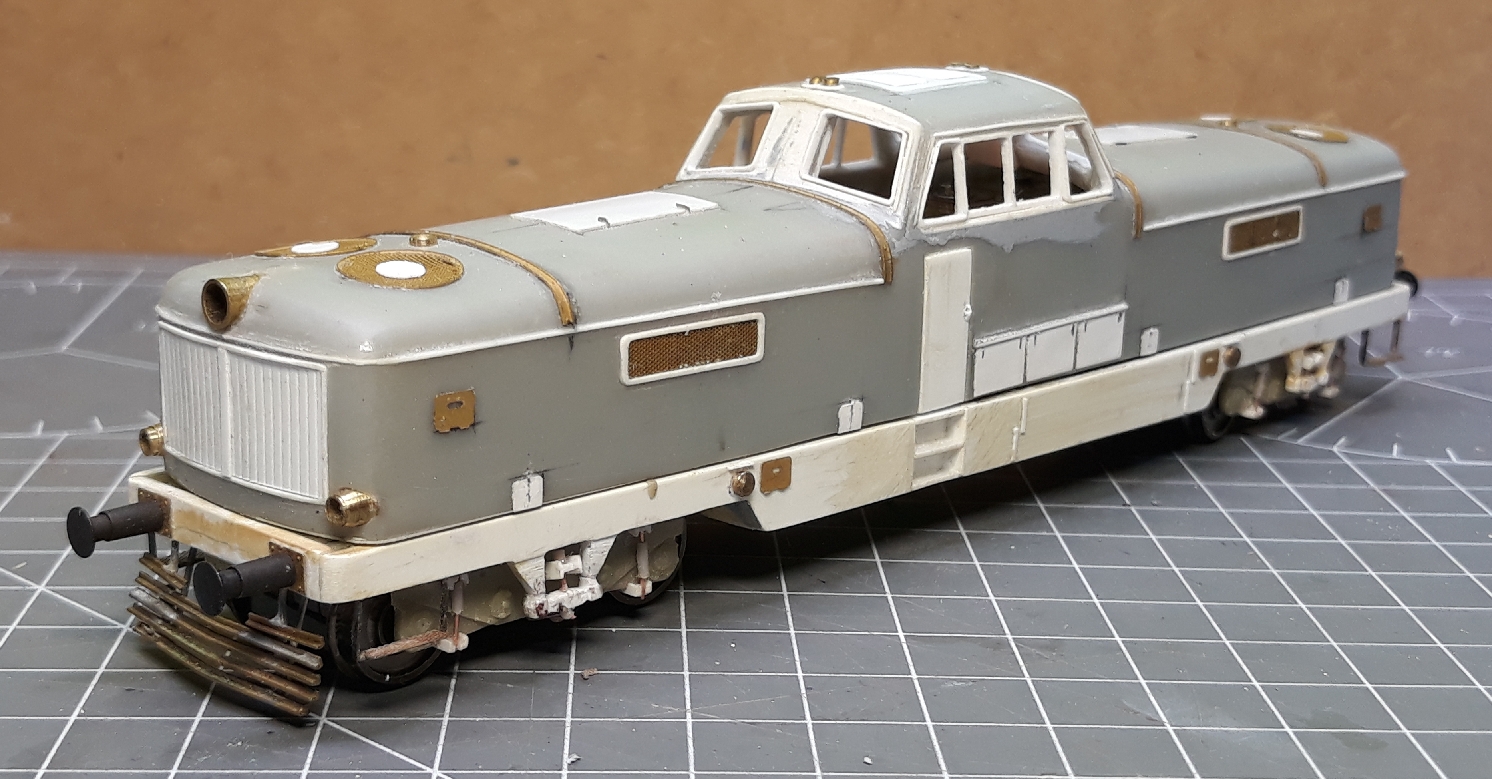 Pluhy som umiestnil na lokomotivu. Pred nastrekom šedomodrej farby som na kapoty upevnil madlá.