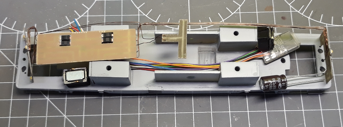 Elektronika je vo všetkych lokomotivach veľmi podobná , tak ju ani nefotím. Jediná zmena je v použití dvoch reproduktorov Zimo 12x8mm. Dekoder je Zimo MX 648. Využivam všetkych 8 funkcii.