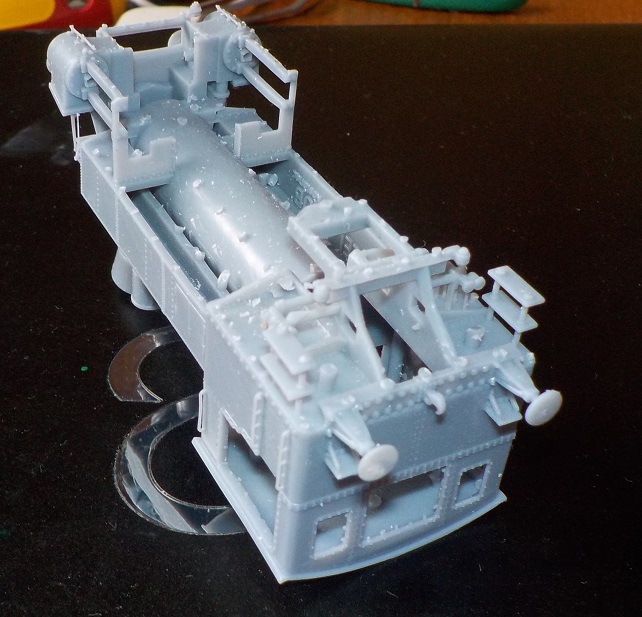 Pixly půjdou dolů, turbo a kompresor asi taky (chtěl bych to do druhé epochy), píšťalu nejspíš osadím mosaznou. Tendr je naznačený deklem, takže na něj hodím ohrádku s uhlím a před boudu možná dodělám tlumič sací brzdy. Na některých fotkách mají boční výřezy budky dodatečné dekly s prosklením (patrně posuvné). To by mohl být zajímavý doplněk, i když šlo asi o "zateplení" na zimu. Zajímavé je, že na tom jednom snímku to byl zjevně prosklený rám, u jiných typů strojů to byly bytelné prkenné okenice. Tentokrát se na nejpostiženějších místech pokusím "vyžehlit" tiskový rastr.