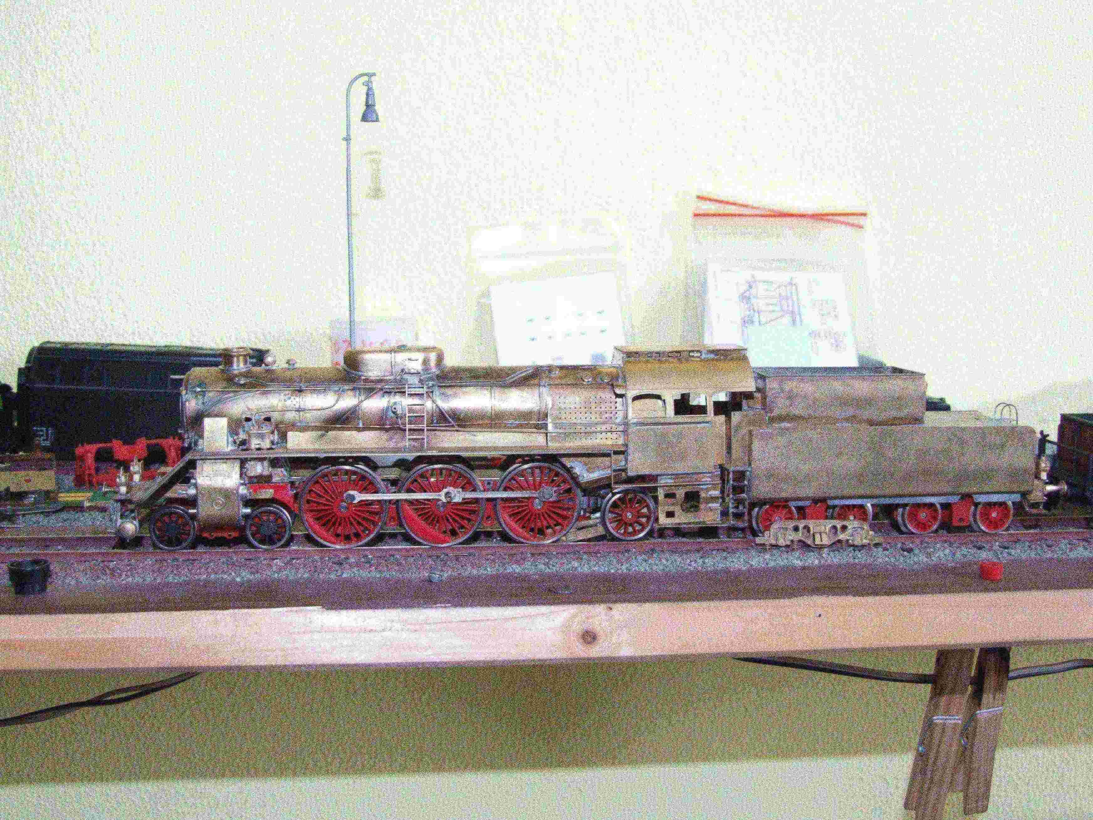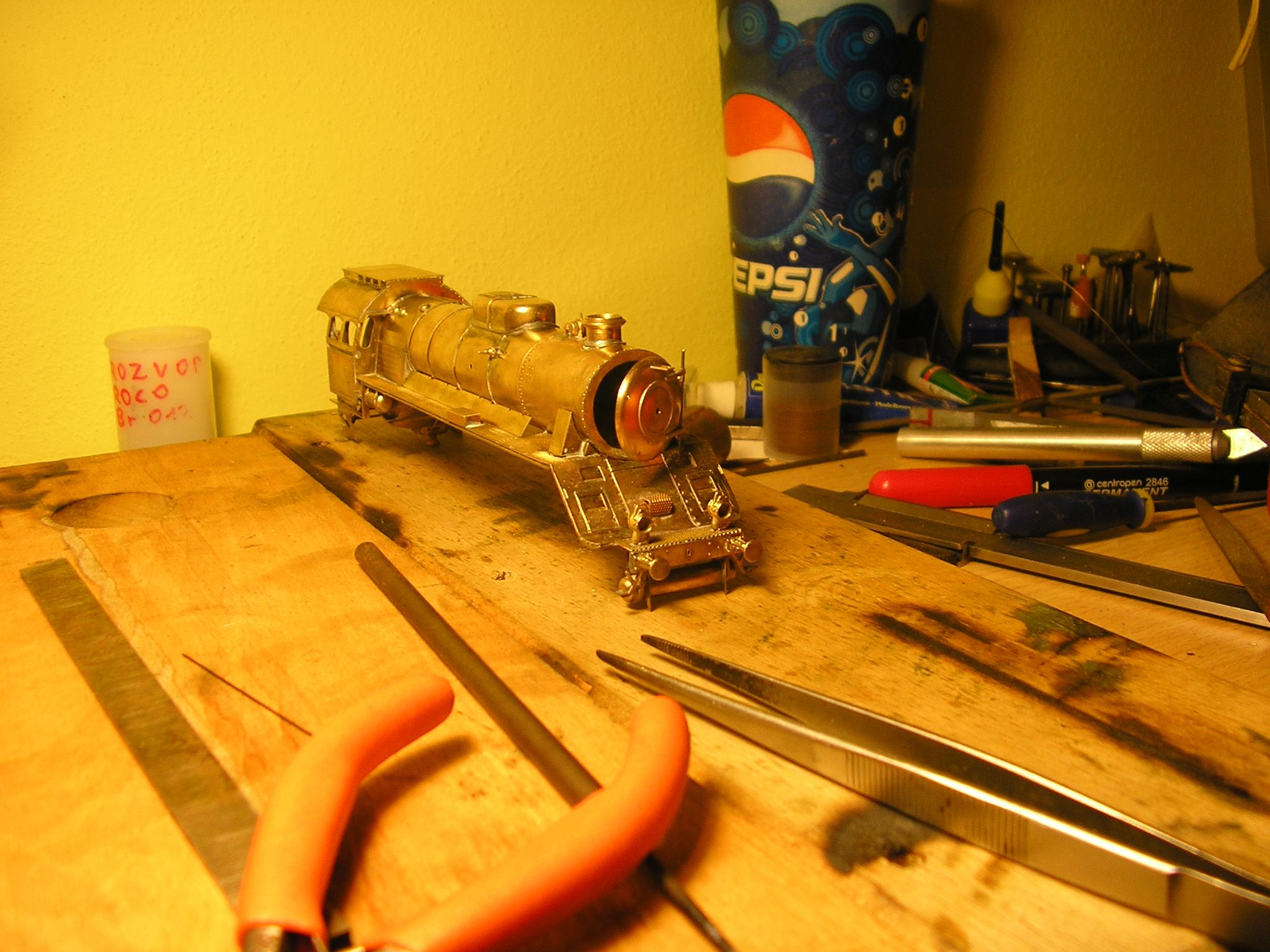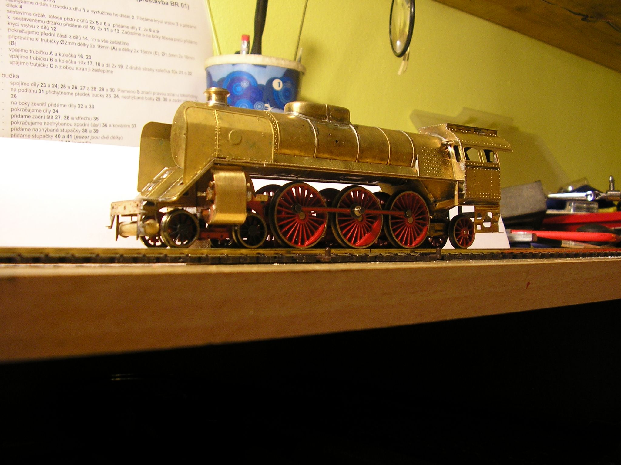 Ahoj kotel jsem navinul na měděnou trubku ktera je současti stavebnice,před tim jsem trubku lehce zkratil a odřezek použil jako navlek na kotel z venku. Před tim jsem však odřezek podelně rozřiznul a trochu roztahnul tak,aby šla nasunout na kotel. Takže trubka vevnitř v kotli i zvenči a po te kotel krasně sletovat. Musi se dat pozor aby jste trubku nepřipajeli ke kotli. Podotykam že je to muj prvni lept,ale mam za sebou zkušene modelaře kteři vždy poradi,jinak bych šel nejdřiv do něčeho jednoduššiho. Pajim plamenem a drobnosti klasickou 100w pistolovou pajkou. K vyrobě komina,parniho dómu a dymničnich dviřek mě inspirovaly již zminěny kolegove zkušeni modelaři,vše je z MS. Dymnice je funkčni (oteviraci) z duvodu instalace zavaži,dekoderu a repro,ktere bude pod kominem. Největši ořišek jsou rozvody,ty zatim nema hotove,hlavně spojeni tak aby to fungovalo a nerozpadlo se,některe časti rozvodu jsem použil origi z 01