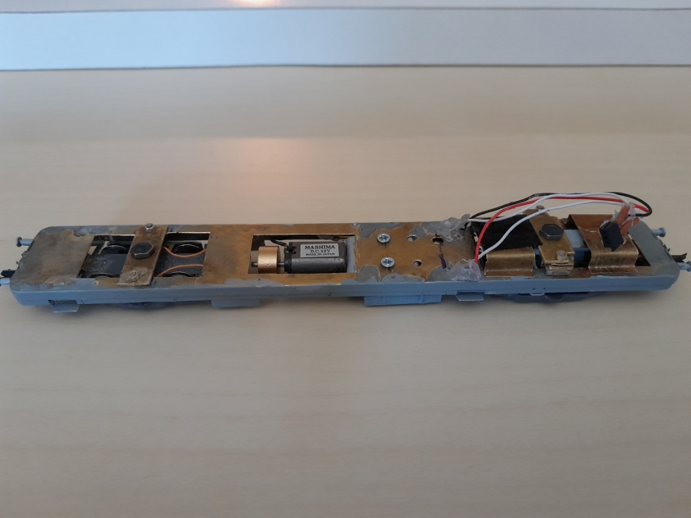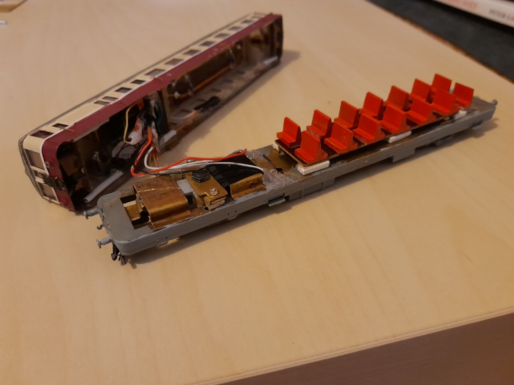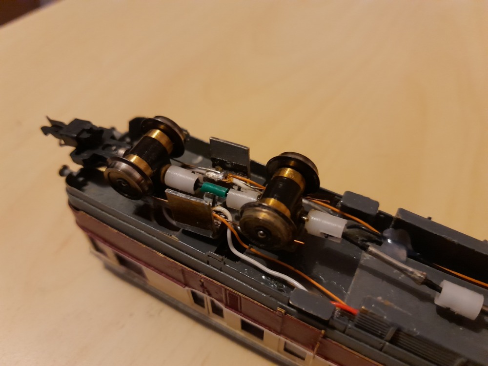 Děkuji za připomínky. Z asi 300 prohlédnutí 2 připomínky za 1 den, to ujde. Těch asi 1,5 mm jsem vypočítal z typového výkresu přes měřítko. Chápu, že to není přesné. Kdybych bral jen průměr kola 8,3 mm tak to bude minimálně 3,5 mm. Stejně to ale v kolejišti nepůsobí rušivě, protože motorák jezdí sám jako lokálka. Pravdu máte, pokud bych to chtěl vystavovat, tak by to vadilo. No zatím to dokončím tak, ložiskové štíty budou na podvozku, spřáhla přilepím na správnou výšku. Do převodovek rozhodně sahat nebudu, v tom je kouzlo řešení. Prostor nad hnaným podvozkem potřebuji na reproduktor, dekodér a závaží. Celý podvozek bych mohl ale o ty 3-4 mm zvednout a zapustit do kabiny. To by nemělo elektroniku moc omezit.