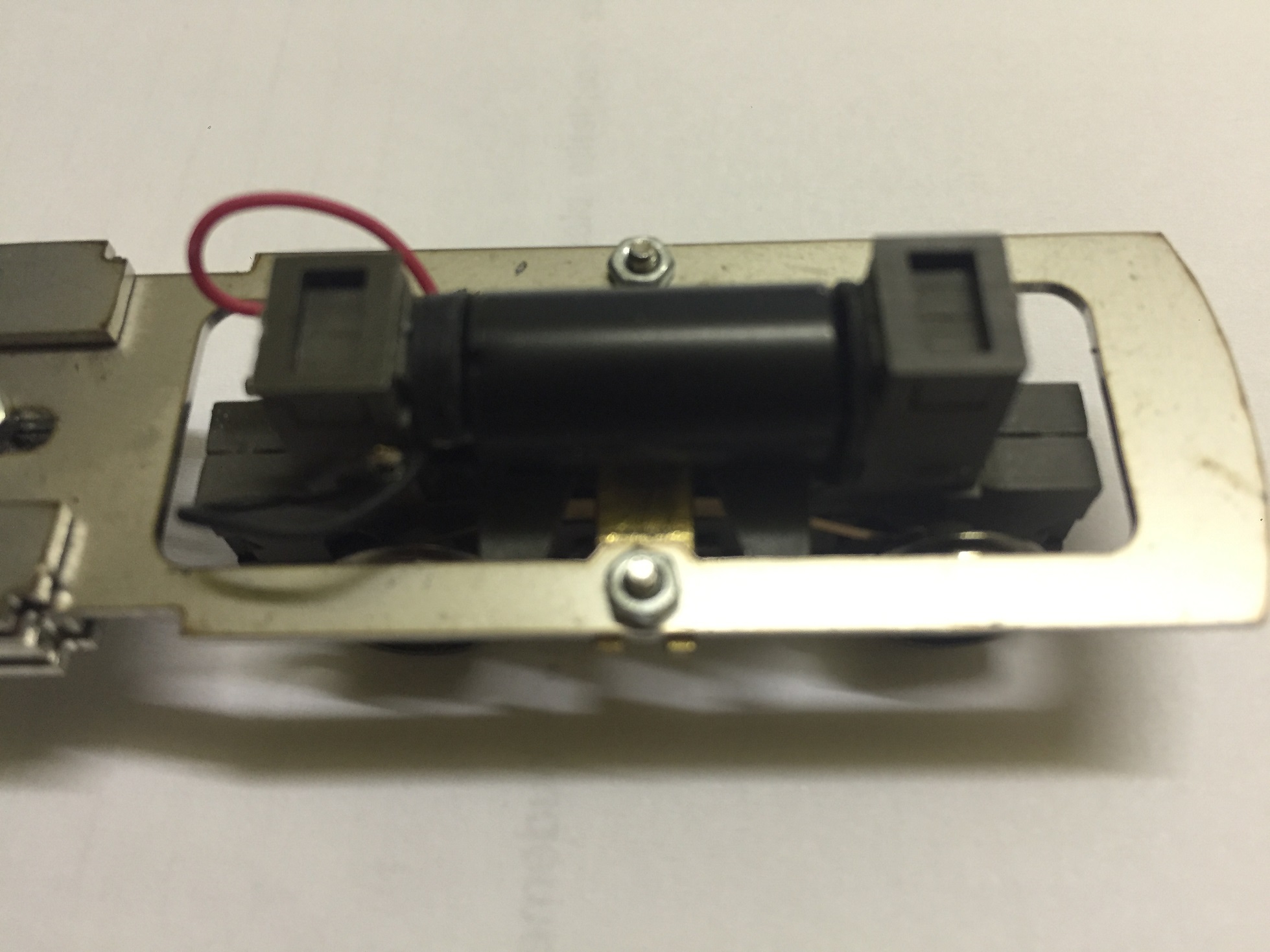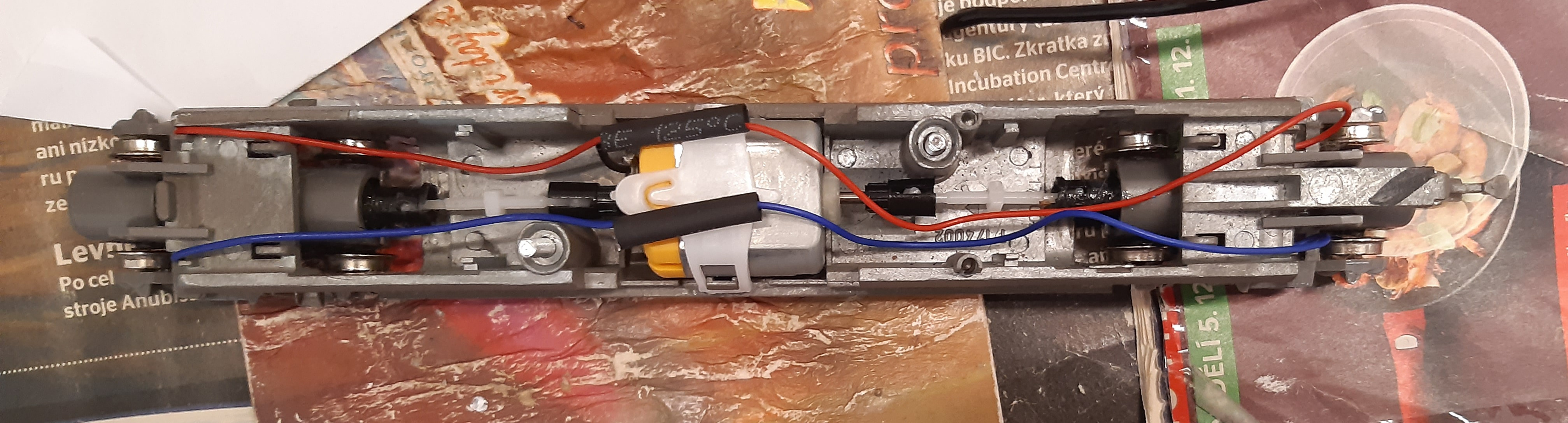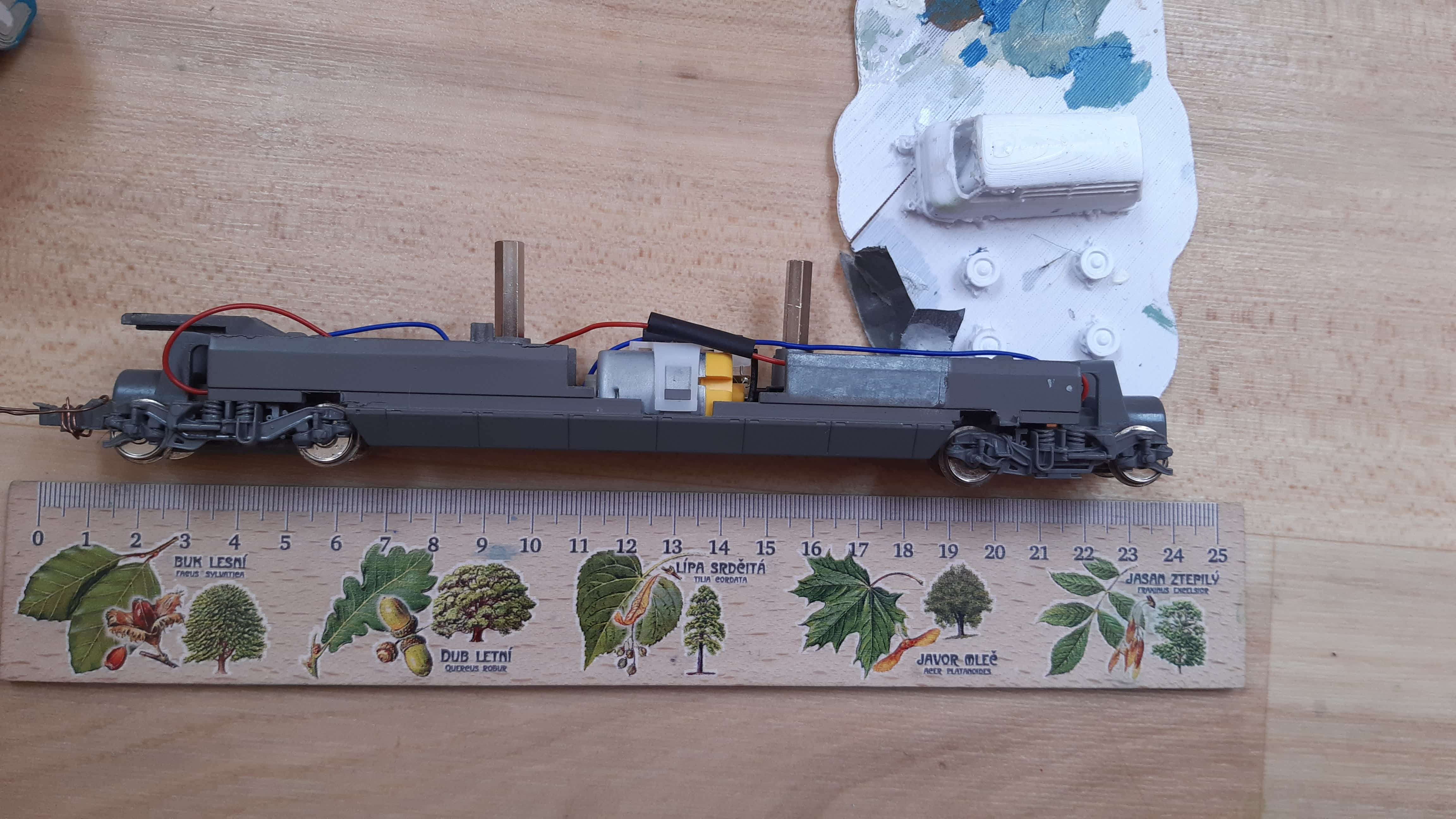 Můj původní záměr byl ho postavit na podvozku, který jsem vykuchal z modelu TGV, ale jak vidíte na obrázku, model jsem tak musel dost zkrátit a žabotlam pak vypadá trochu směšně. Proto bych se tedy chtěl zeptat , jestli nevíte, kde by se dal sehnat model pojezdu pro žabotlam v tomto měřítku.